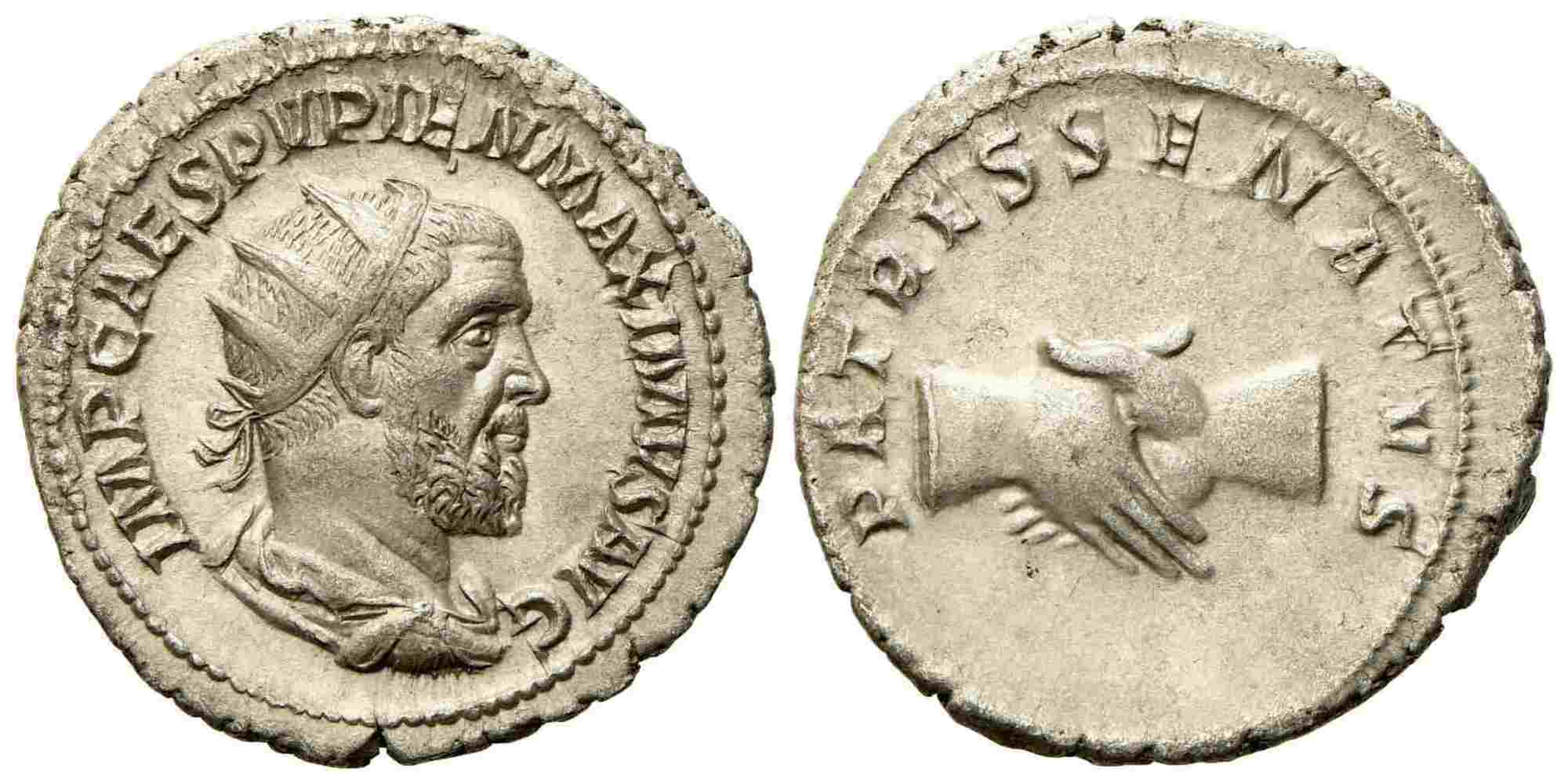 Pupienus (238), Antoninianus, Rome, c. April-June AD 238; AR (g 4,56; mm 22,5); IMP CAES M PVPIEN MAXIMVS AVG, radiate, draped & cuirassed bust right, Rv. PATRES SENATVS, clasped right hands. RIC 11b; C 21. Good extremely fine.