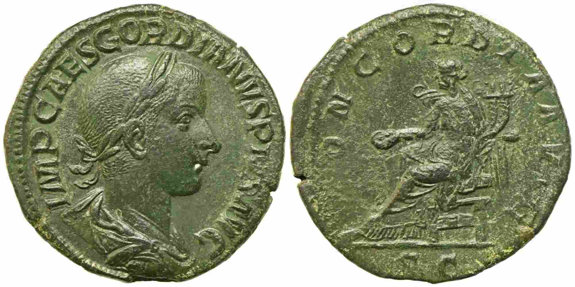 Gordian III (238-244), Sestertius, Rome, AD 240; Æ (g 16,37; mm 31); IMP CAES GORDIANVS PIVS AVG, laureate, draped and cuirassed bust r., Rv. CONCORDIA AVG, Concordia seated l., holding patera and double cornucopia; in ex. S C. RIC 278a; C 54. Green patina; double strike on reverse (?); good very fine.