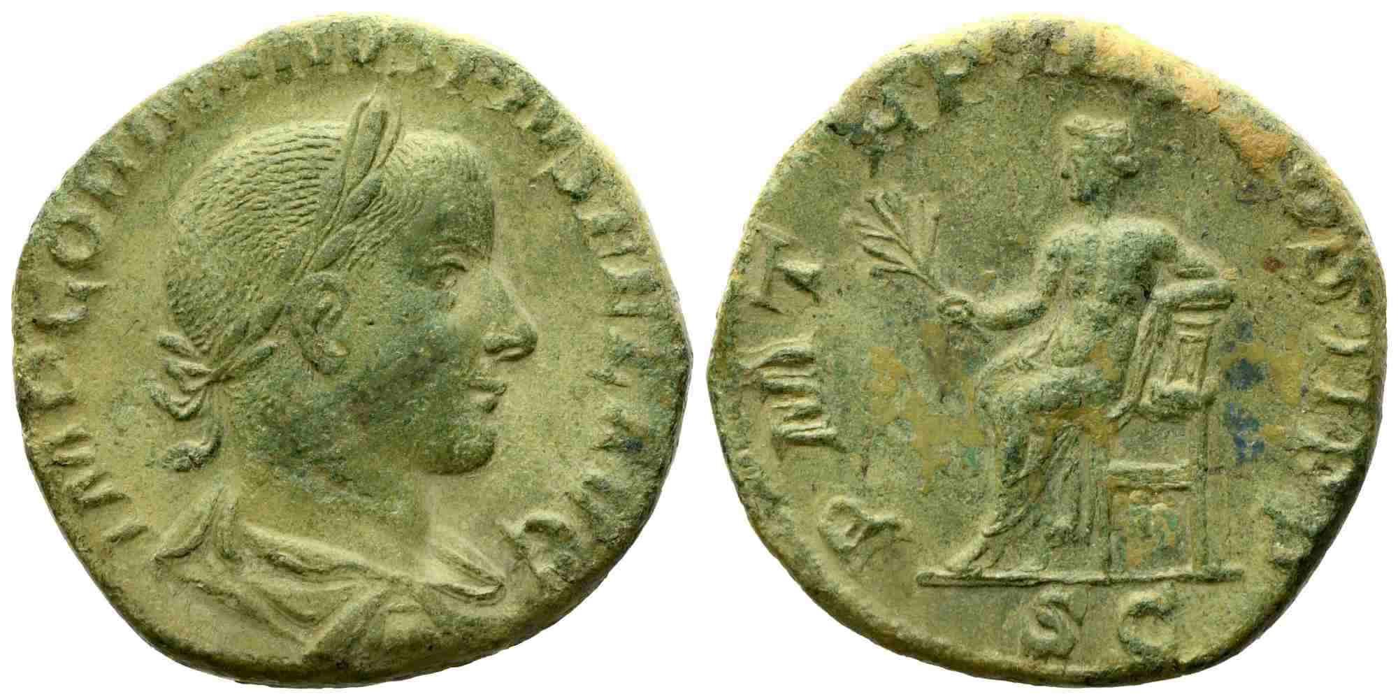 Gordian III (238-244), Sestertius, Rome, AD 241-243; Æ (g 19,45; mm 28); IMP GORDIANVS PIVS FEL AVG, laureate, draped and cuirassed bust r., Rv. P M T - R P IIII COS II P P, Apollo seated l., holding laurel branch; in ex. S C. RIC 302; C 251. Green patina; extremely fine.