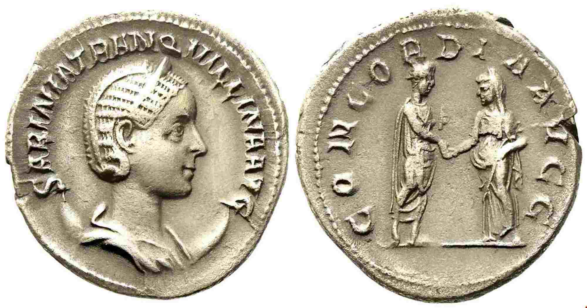 Tranquillina, Antoninianus struck under Gordian III, Antioch, c. AD 241; AR (g 3,85; mm 22); AR SABINA TRANQVILLINA AVG, diademed, draped bust r., set on crescent, Rv. CONCORDIA AVGG, Gordian III standing l., holding a roll in his left hand, clasping hand of Tranquillina standing r. RIC 250; C 4. Extremely fine.