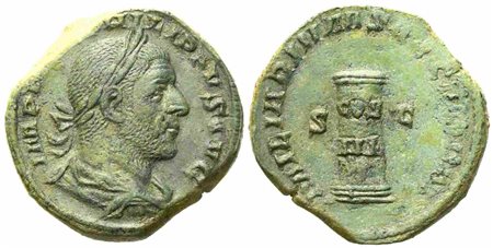 Philip I (244-249), Sestertius, Rome, AD 248; Æ (g 19,54; mm 29); IMP M IVL PHILIPPVS AVG, laureate, draped and cuirassed bust r., Rv. MILIARIVM SAECVLVM, low column inscribed COS / III; in field, S - C. RIC 157a; C 95. Scarce. Light green patina with blue shades; good extremely fine.