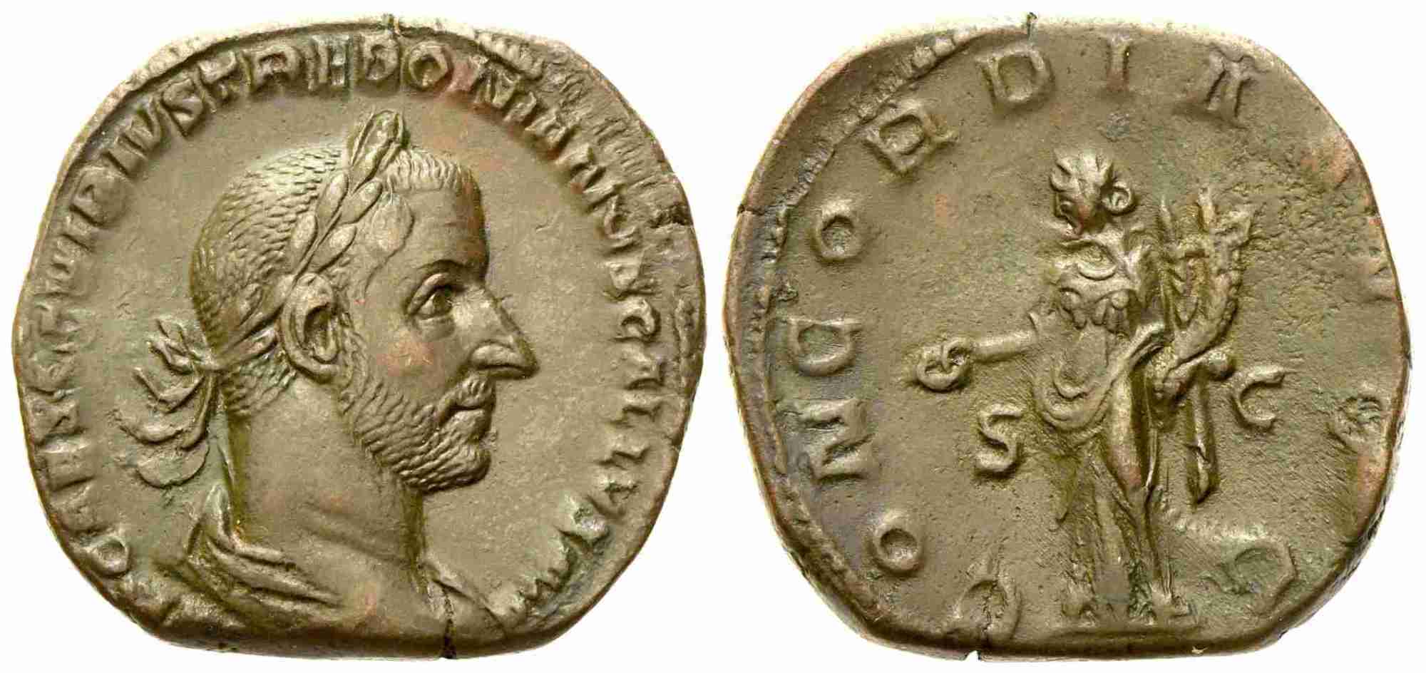 Trebonianus Gallus (251-253), Sestertius, Rome, AD 251-253; Æ (g 19,37; mm 28); IMP CAES C VIBIVS TREBONIANVS GALLVS AVG, laureate, draped and cuirassed bust r., Rv. CONCORDIA AVGG, Concordia standing l., holding patera and double cornucopia; in field, S - C. RIC 105a; C 30. Brownish patina; expressive portrait; about extremely fine.
