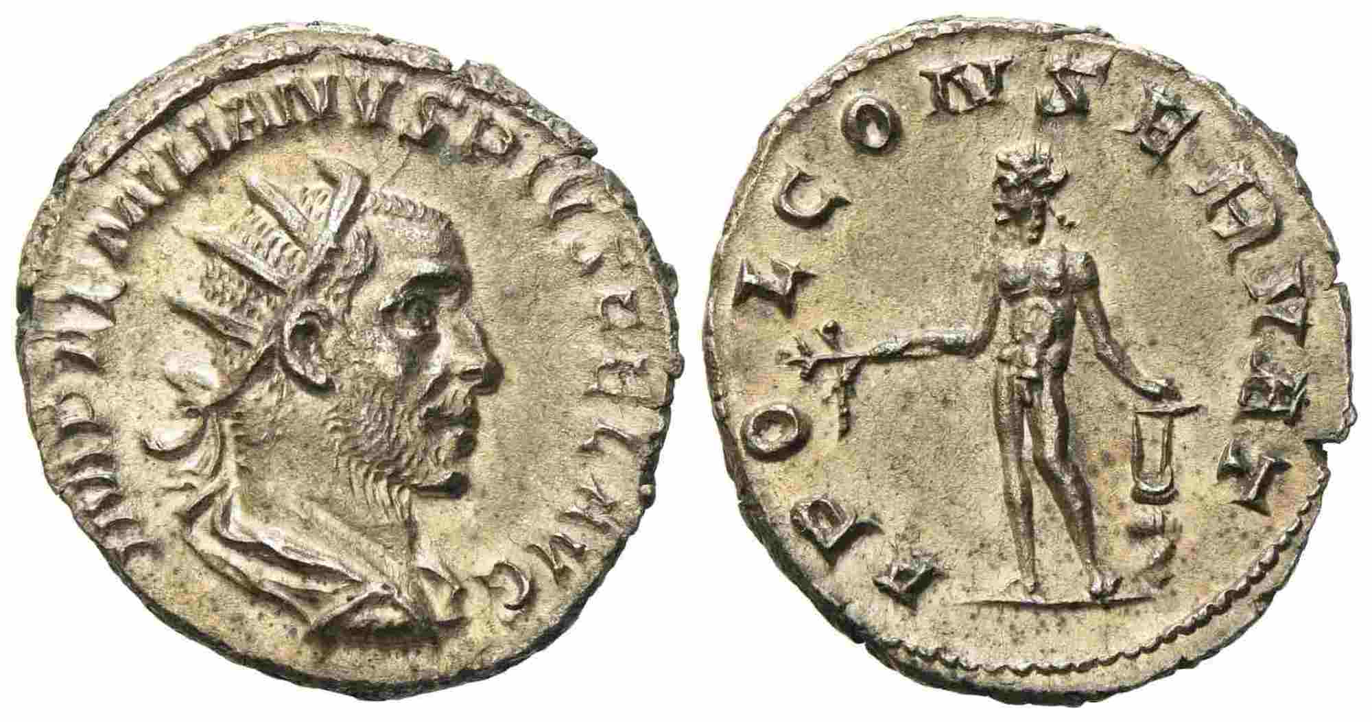 Aemilian (253), Antoninianus, Rome, AD 253; AR (g 3,59; mm 21,1); IMP AEMILIANVS PIVS FEL AVG, radiate, draped and cuirassed bust r., Rv. APOL CONSERVAT, Apollo standing l., resting against lyre and holding branch. RIC 1; C 2; Sear 9830. Good extremely fine / about Fdc. Refined style.