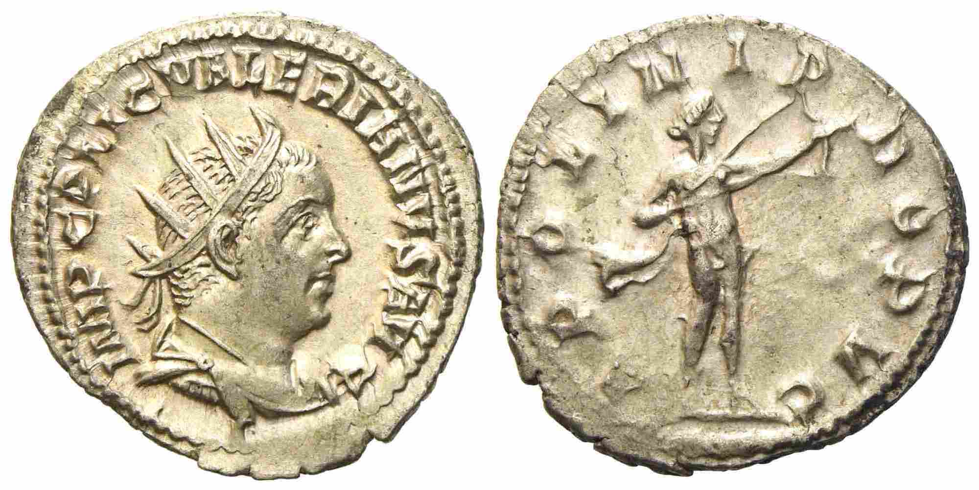 Valerian I (253-260), Antoninianus, Rome, AD 253-254; AR (g 3,32; mm 21,7); IMP C P LIC VALERIANVS AVG, radiate, draped and cuirassed bust r., Rv. APOLINI (sic!) PROPVG, Apollo standing r., drawing bow. RIC 74; C 25. Good extremely fine / about Fdc.