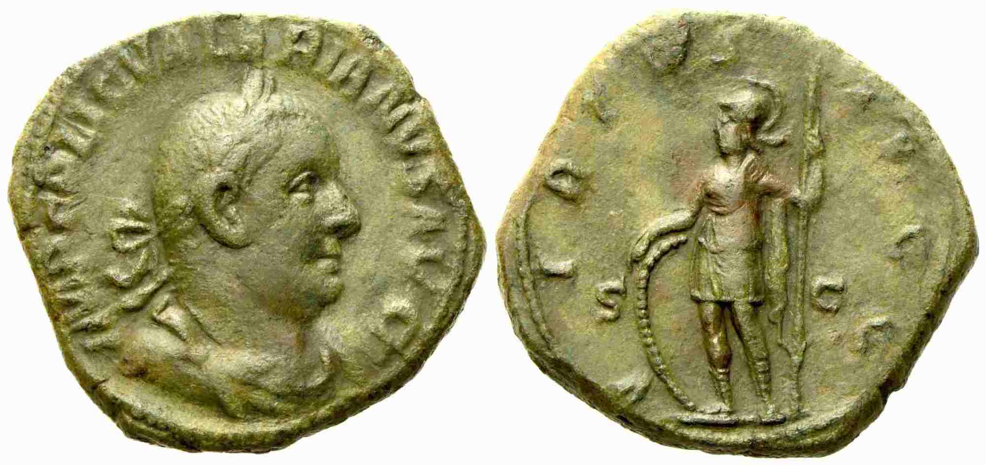 Valerian I (253-260), Sestertius, Rome, AD 254; Æ (g 20,75; mm 31); IMP C P LIC VALERIANVS AVG, laureate, draped and cuirassed bust r., Rv. VIRTVS - AVGG, soldier standing l., holding spear and leaning on shield; in field, S - C. RIC 182; C 269. Grey-green patina; nice portrait; extremely fine.