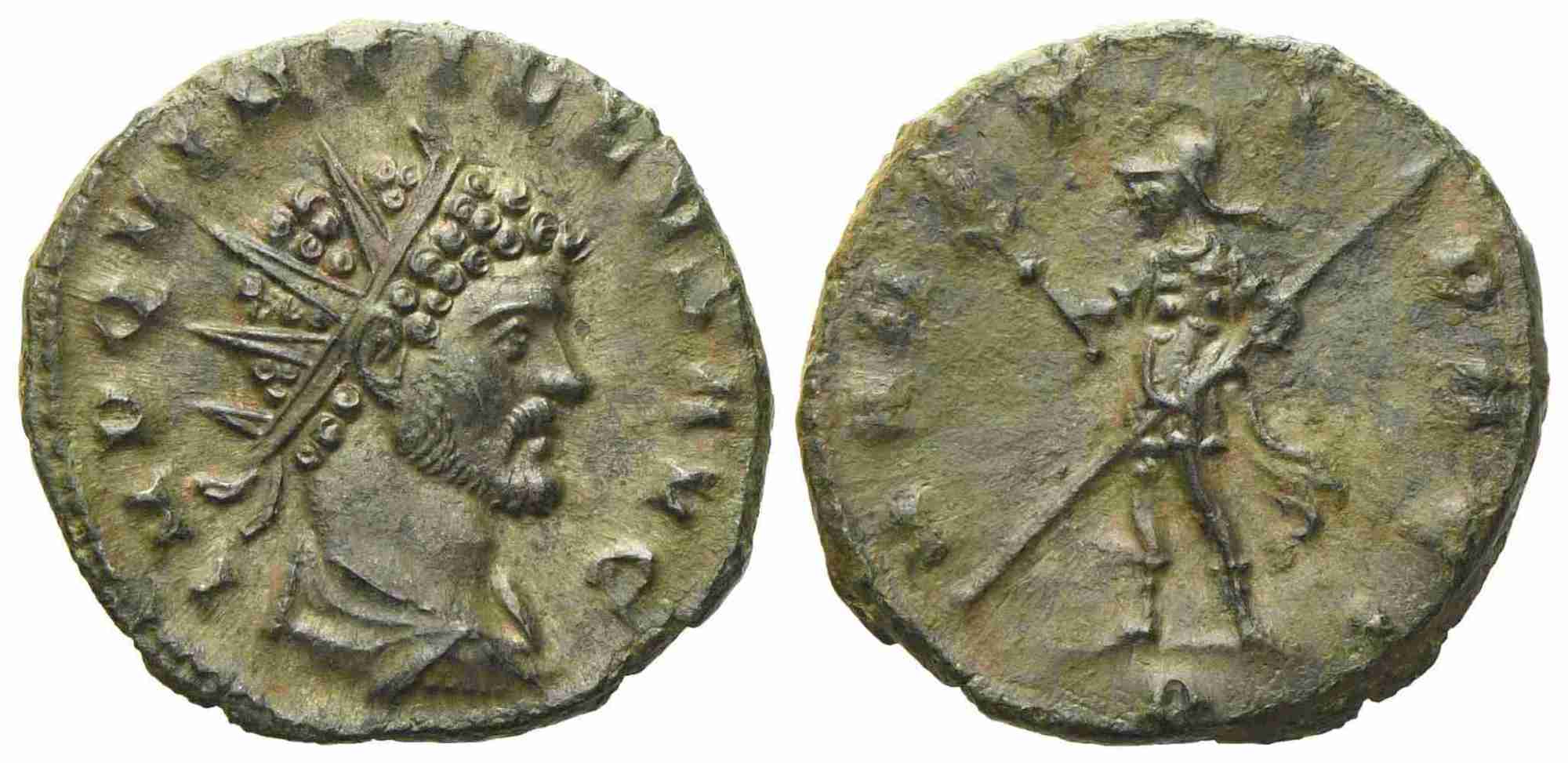 Quintillus (270), Antoninianus, Mediolanum, undated; AR (g 3,35; mm 19,8); IMP QVINTILLVS AVG, radiate and draped bust r., Rv. MARTI PACI, Mars standing l., holding branch and spear, officina letter [P] in ex. RIC 58; C 47. Good extremely fine.