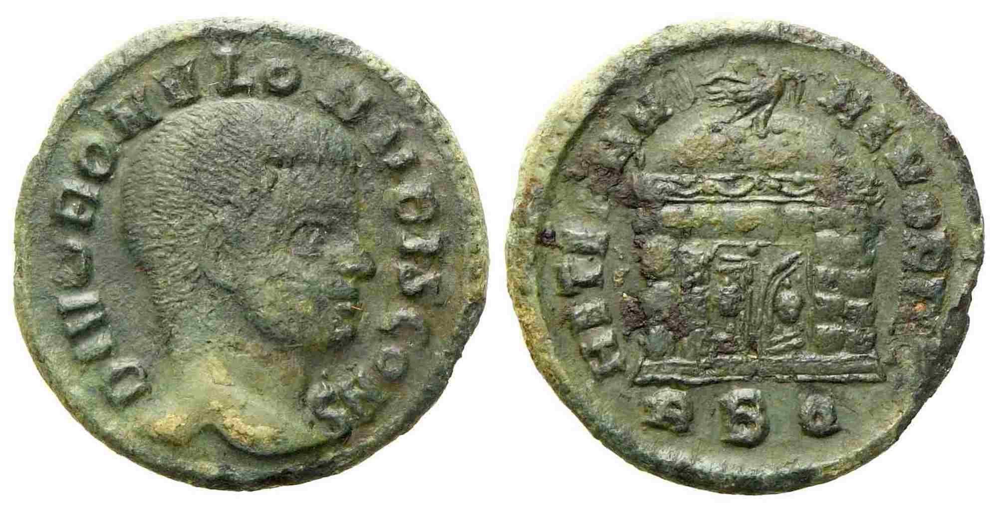 Divus Romulus, Half Follis struck under Maxentius, Rome, c. AD 310; Æ (g 2,42; mm 16); DIVO ROMVLO N V BIS CONS, bare head r., Rv. AETERNAE - MEMORIAE, domed shrine surmounted by eagle; in ex. RBQ. RIC 207. Scarce. Green patina with ligther hues; extremely fine.