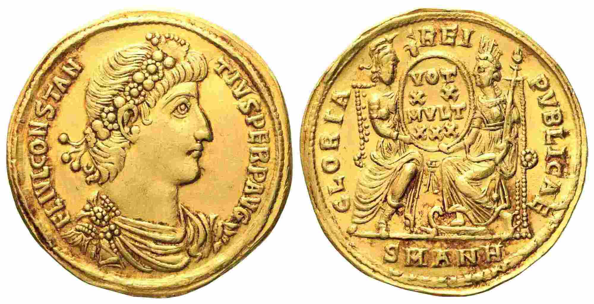 Constantius II (337-361), Solidus, Antiochia, AD 347-355; AV (g 4,48; mm 21); FL IVL CONSTAN - TIVS PERP AVG, diademed, draped and cuirassed bust r., Rv. GLORIA - REI - PVBLICAE, Roma and Constantinopolis seated facing, holding between them wreath inscribed VOT / XX / MVLT / XXX; in ex. S M AN H. RIC 84. Minor edge bumps; otherwise about extremely fine.