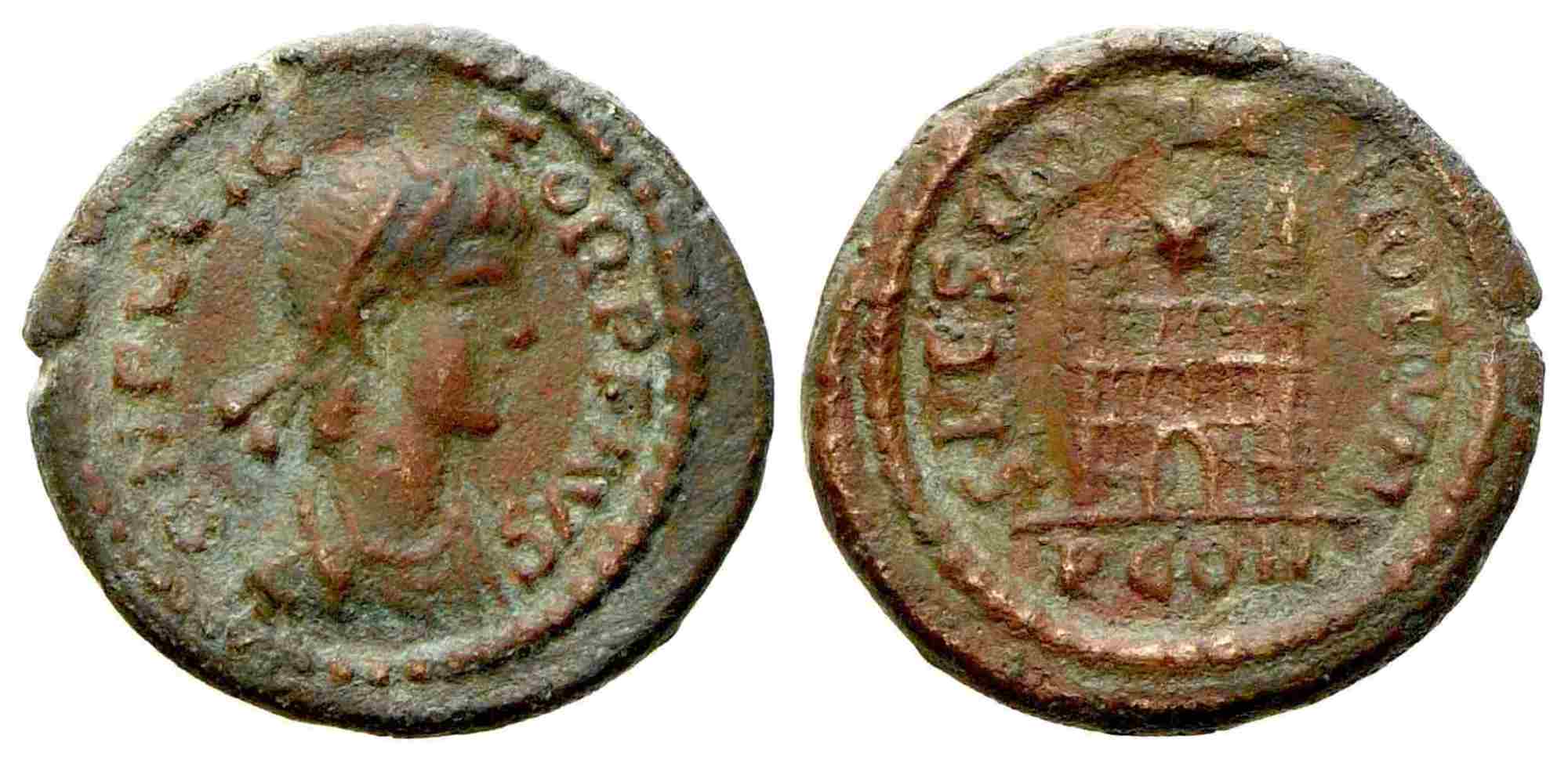 Flavius Victor (387-388), Æ 4, Arelate; Æ (g 2,04; mm 15); DN FL VIC-TOR P F AVG, pearl-diademed, draped and cuirassed bust r., Rv. SPES RO-MA-NORVM, camp-gate with star between its two turrets; PCON (mintmark) in ex. RIC 29b; C 3. Reddish tone with green hues; extremely fine.