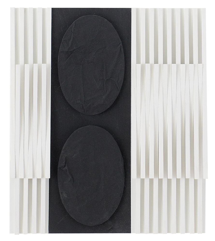 acrilici su rilievi cm. 40x34,5; firma, anno, etichetta e archivio dell'artista al retro, dichiarazione d'autenticità e archivio dell'artista su foto, entro teca in plexiglass.