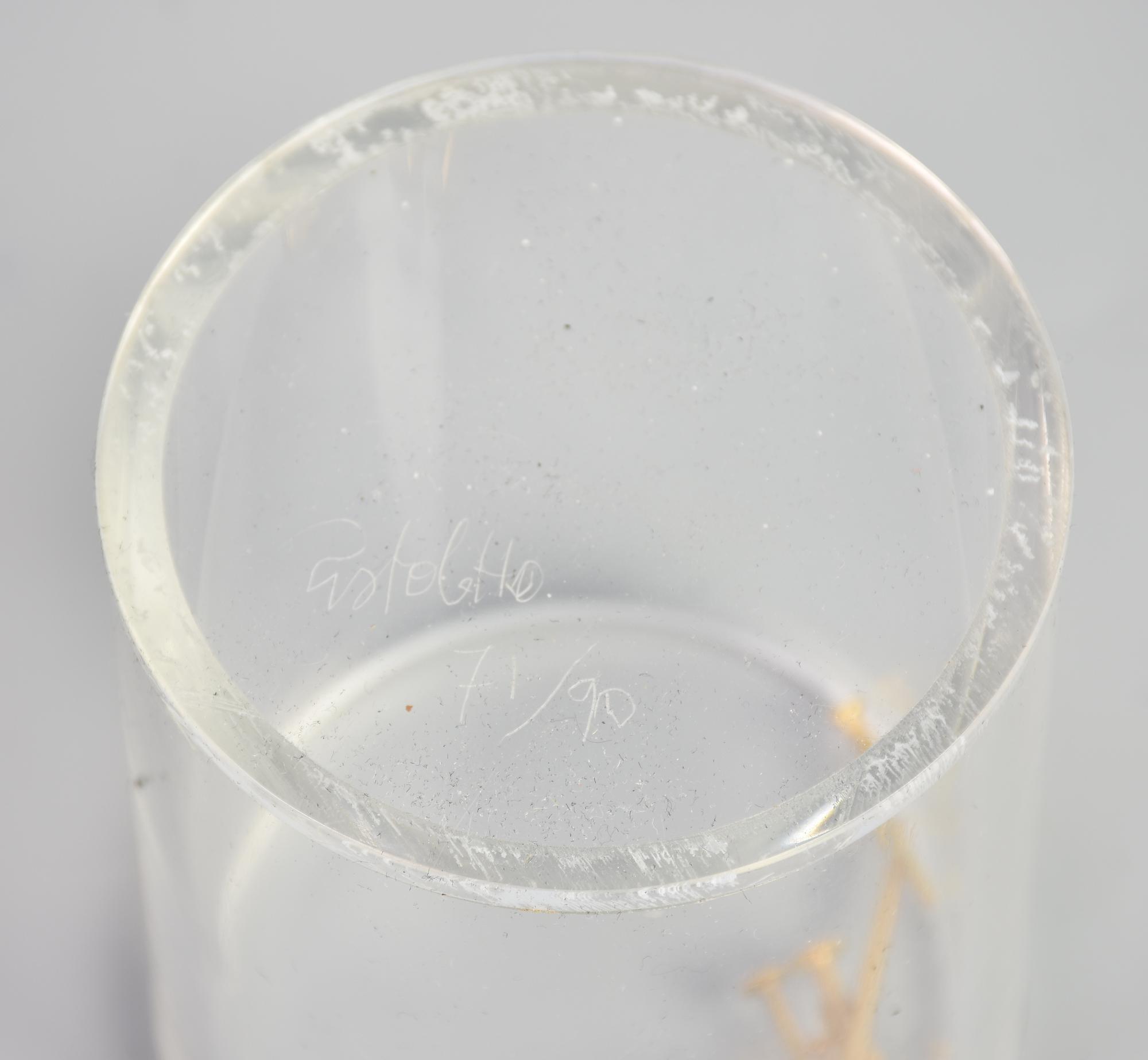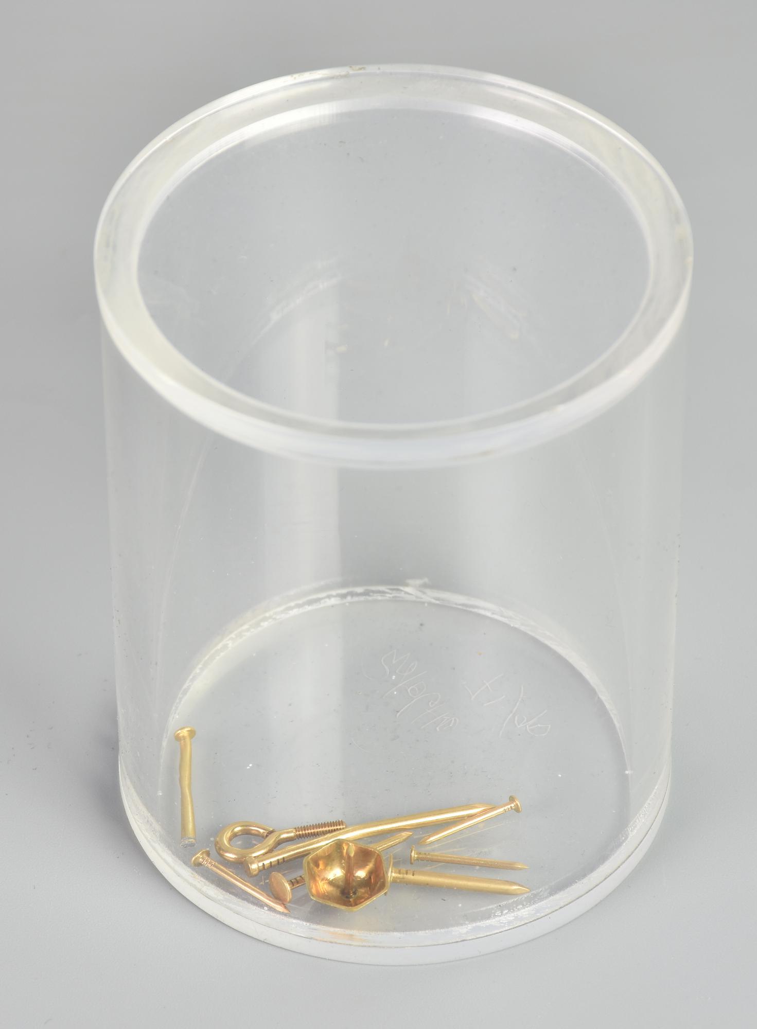 multiplo contenente chiodi dorati entro cilindro in plexiglass, cm 10x8x8; es. 71/90