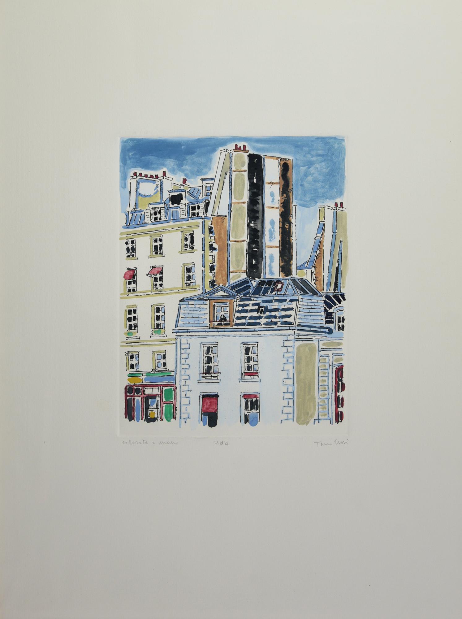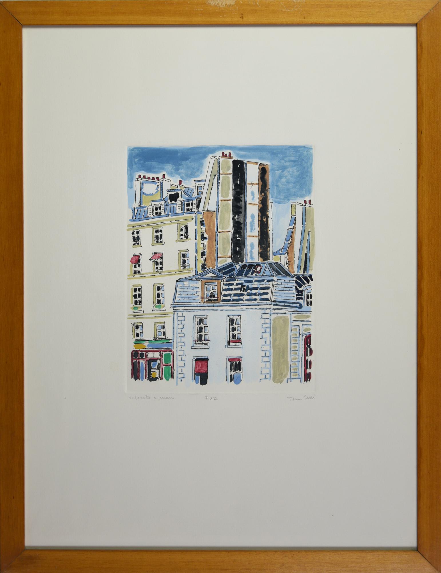 Orfeo Tamburi PARIGI acquaforte-acquatinta colorata a mano, cm 27x20,5, su...