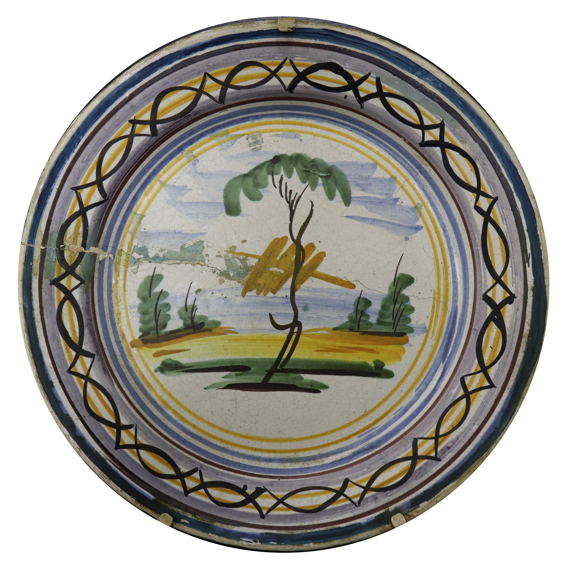 Piatto in maiolica di Caltagirone Al centro paesaggio fluviale con alberi, Mid 20th diametro cm 44 Filato.Filato.