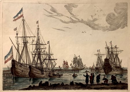 Copia da quattro velieri olandesi dietro un frangiflutti Cm 44x57 Incisione ad acquaforte colorata a mano di Reinier Nooms, firmato in basso a sinistra Sriklomly B.