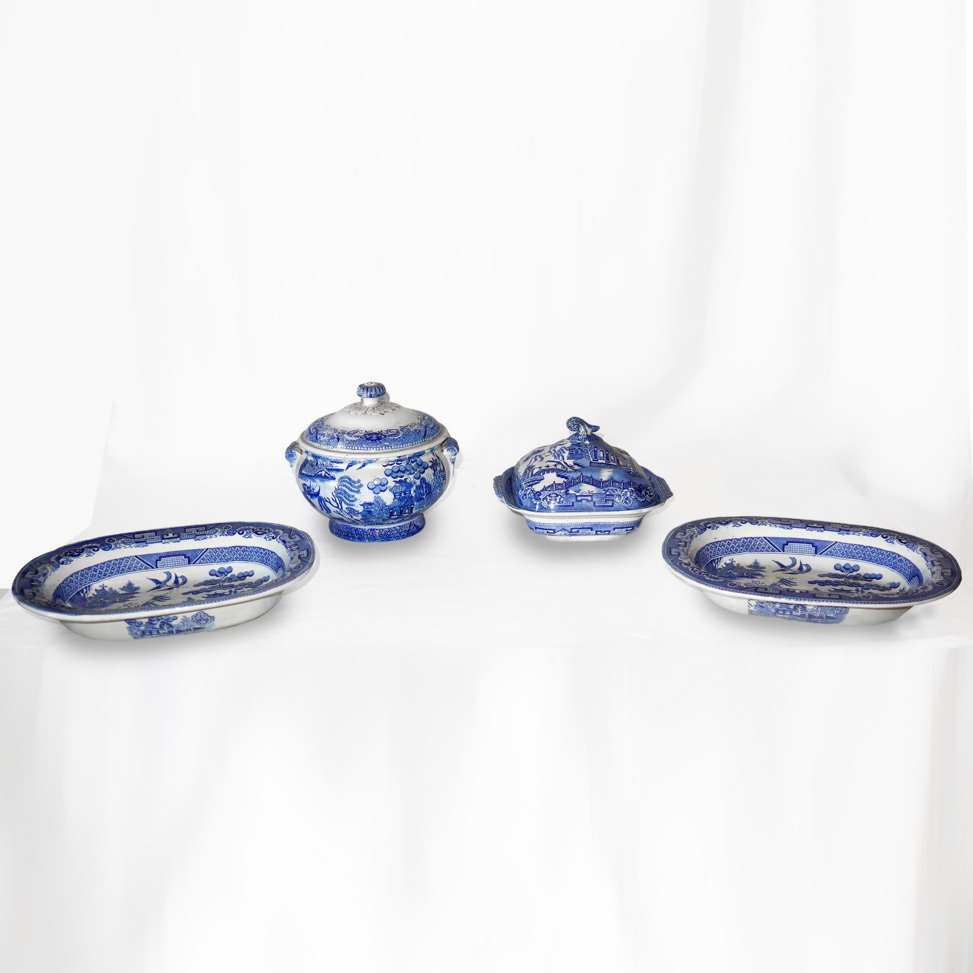 Due piatti fondi ovali e due potiches con disegni orientali Cm 31 x 24, putiche h cm 13 x 23