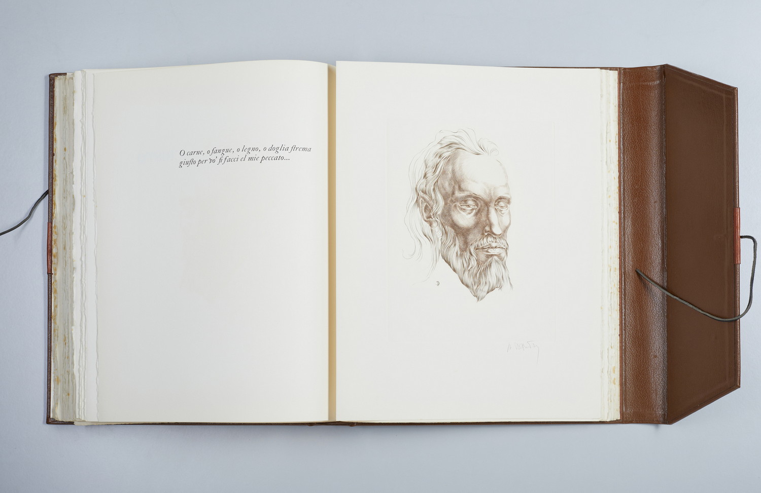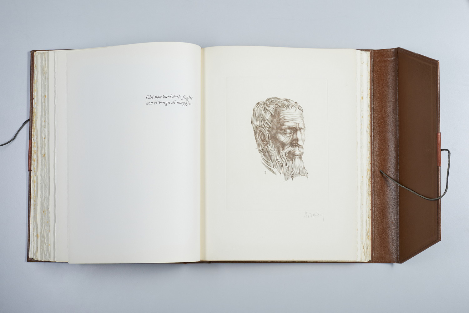 DAUTRY MARC (1930 - 2008) MICHELANGIOLO BUONARROTI, 1975. Libro d'artista. Cm 35,50 x 44,00 x 5,00. 1229/2000. Raccolta di 2 volumi contenenti 17 incisioni in rame. Firma a matita su ogni foglio. Edizione totale: 2000 esemplari di cui 30 fuori commercio, 8 ad personam corredati da una lastra originale in rame, 16 ad personam accompagnati da un disegno originale in sanguigna, 126 corredati da una serie di incisioni su carta giappone con numeri da I a CXXVI, 1820 completi di incisioni su carta arches, numerati da 1 a 1820. Dimensione foglio: 43x32.5 cm. Dimensione lastra: 26.7x20.7 cm. Editore: Eldec spa Edizioni pregiate, Roma. Carta a mano Grand Velin d'Arches, Cartiere Arches. Stampate in torchio a mano da Manuel Robbe. Il carattere del testo Caslin Two Lines Pica è stato fuso appositamente per questa edizione dalla Foderia Caslon Radiguer di Parigi su matrici originali del 1734. La composizione a mano, l'impaginazione e la stampa tipografica sono state eseguite da Yvette e Jean Paul Vibert. Legatura eseguita dalla Legatoria Conti Borbone di Milano. Lievi difetti.