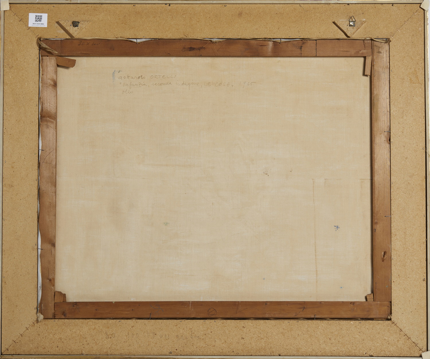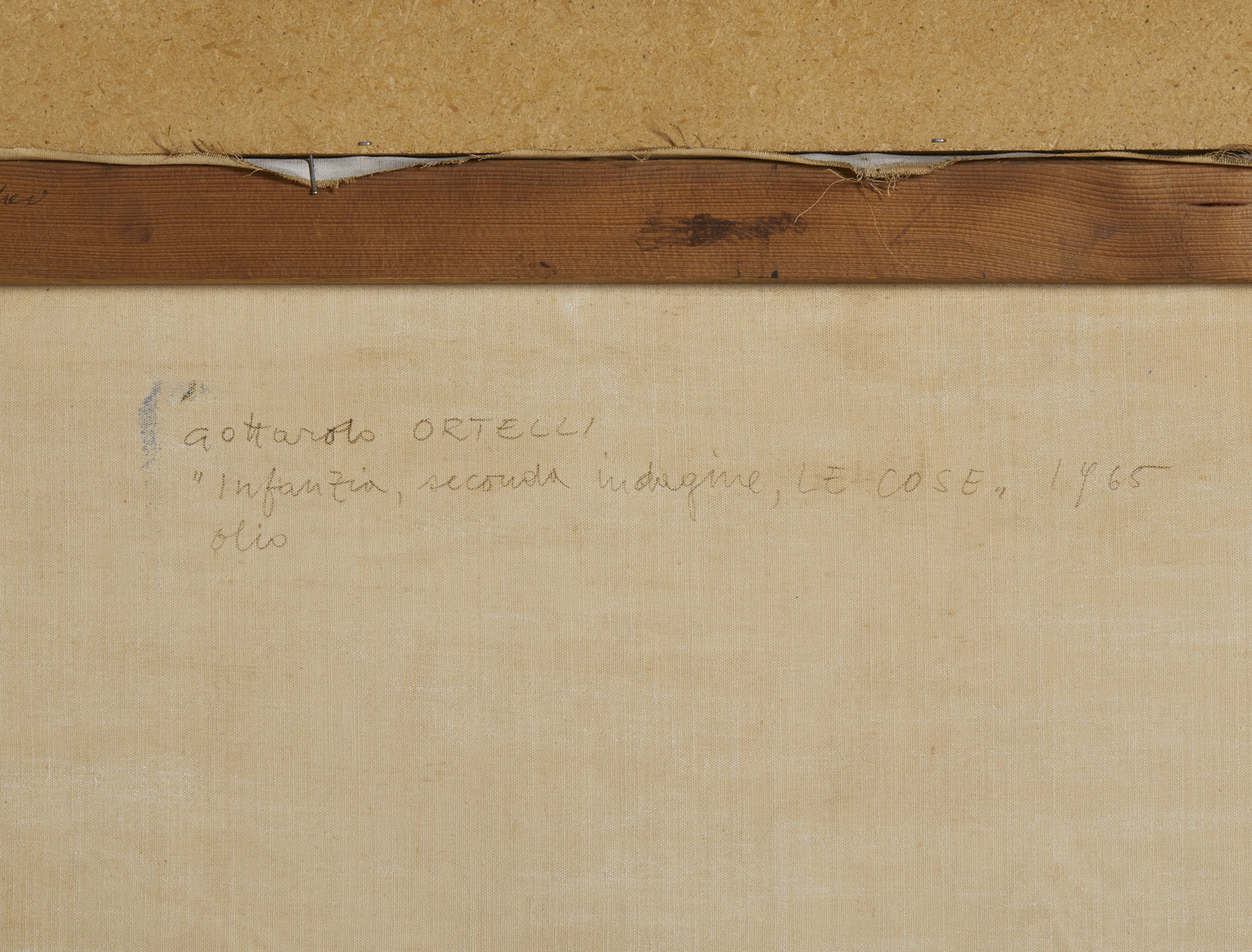 ORTELLI GOTTARDO (1938 - 2003) INFANZIA, SECONDA INDAGINE, LE COSE, 1965. olio su tela. Cm 100,00 x 80,00. sul retro: firma, titolo e data. . Cornice presente