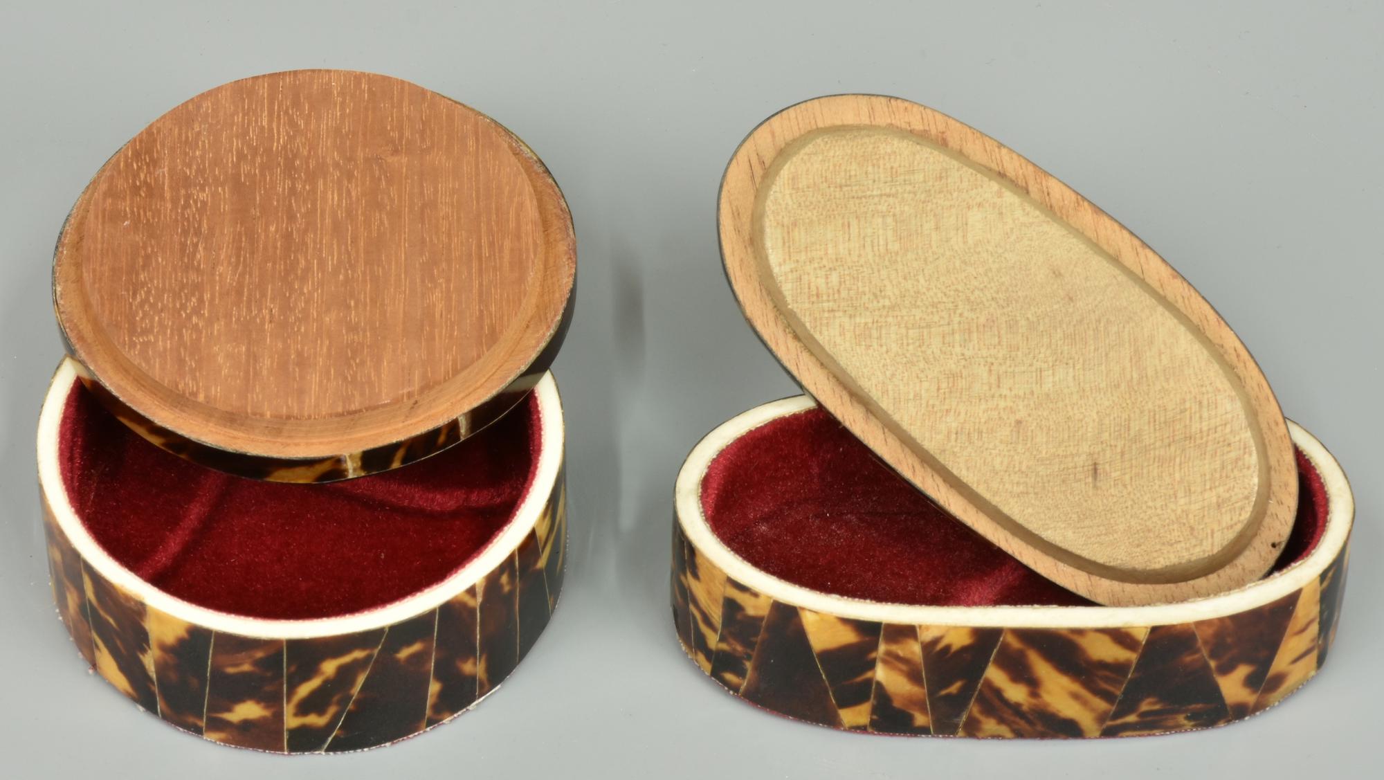 COPPIA DI SCATOLE in legno, rivestite in celluloide 1) 11x3,5x5,5 cm 2) 9x4 cm