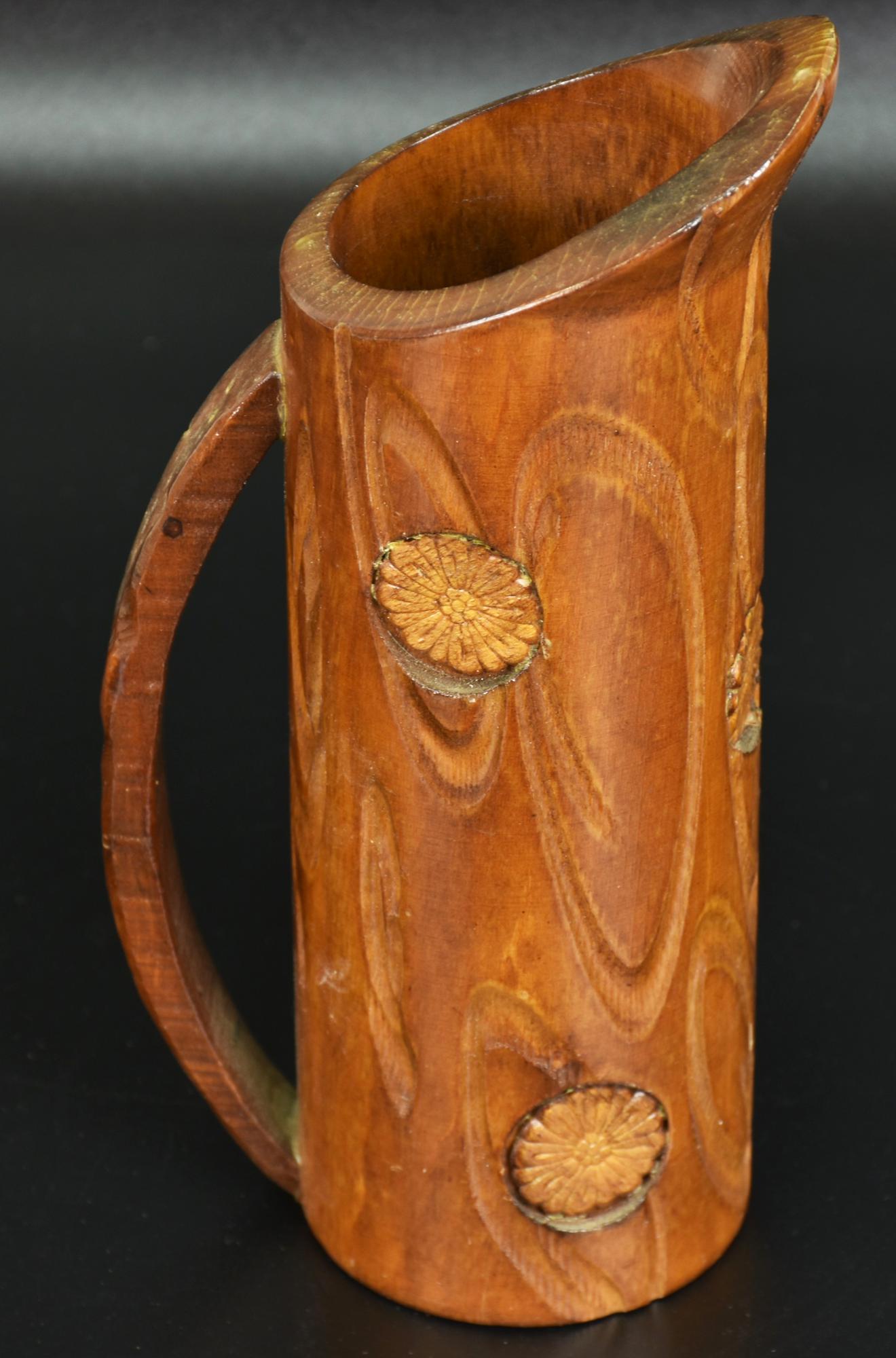 boccale in legno di faggio laccato e intagliato con motivi floreali