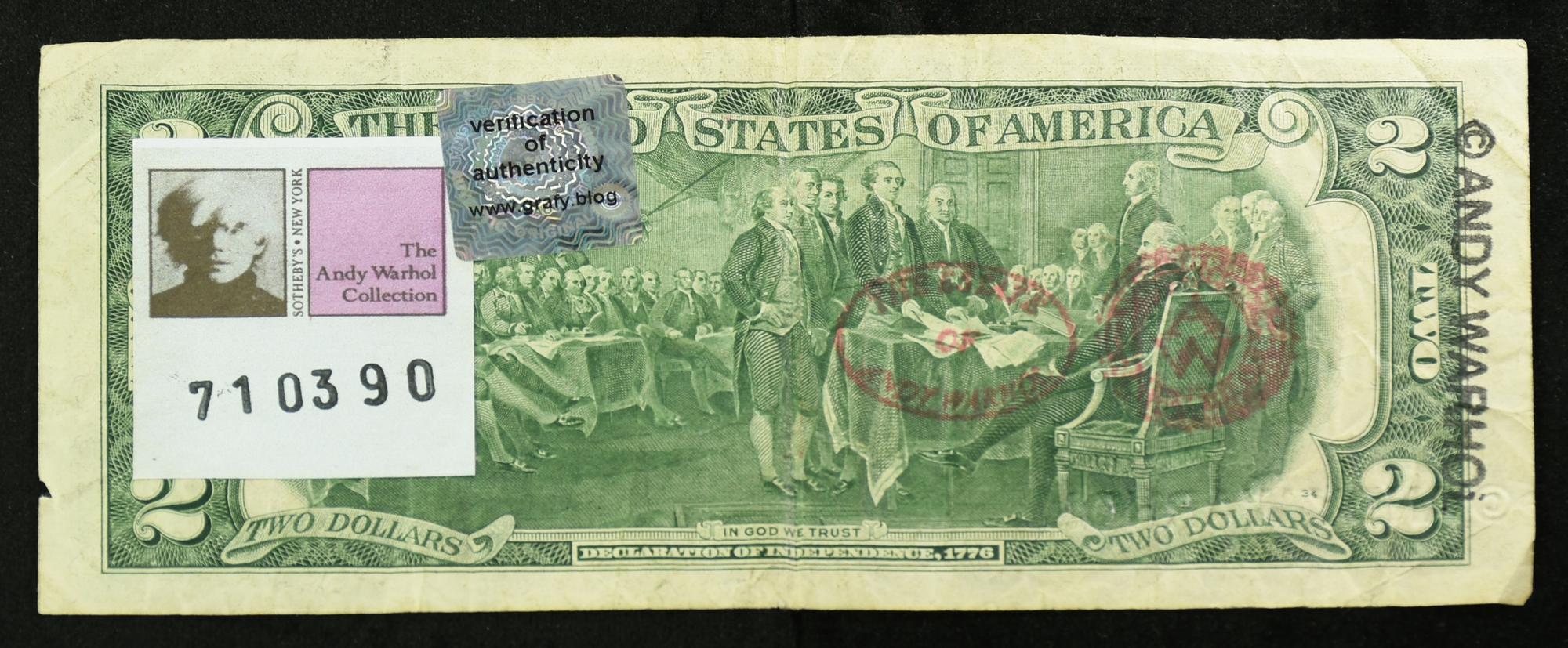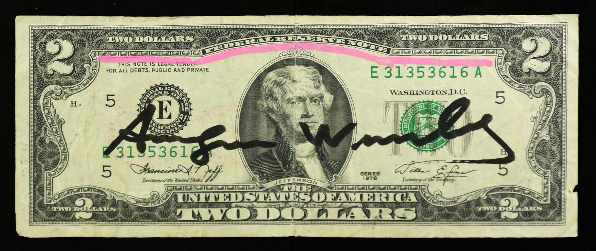 Andy Warhol TWO DOLLARS (Thomas Jefferson) pennafeltro su banconota, cm...