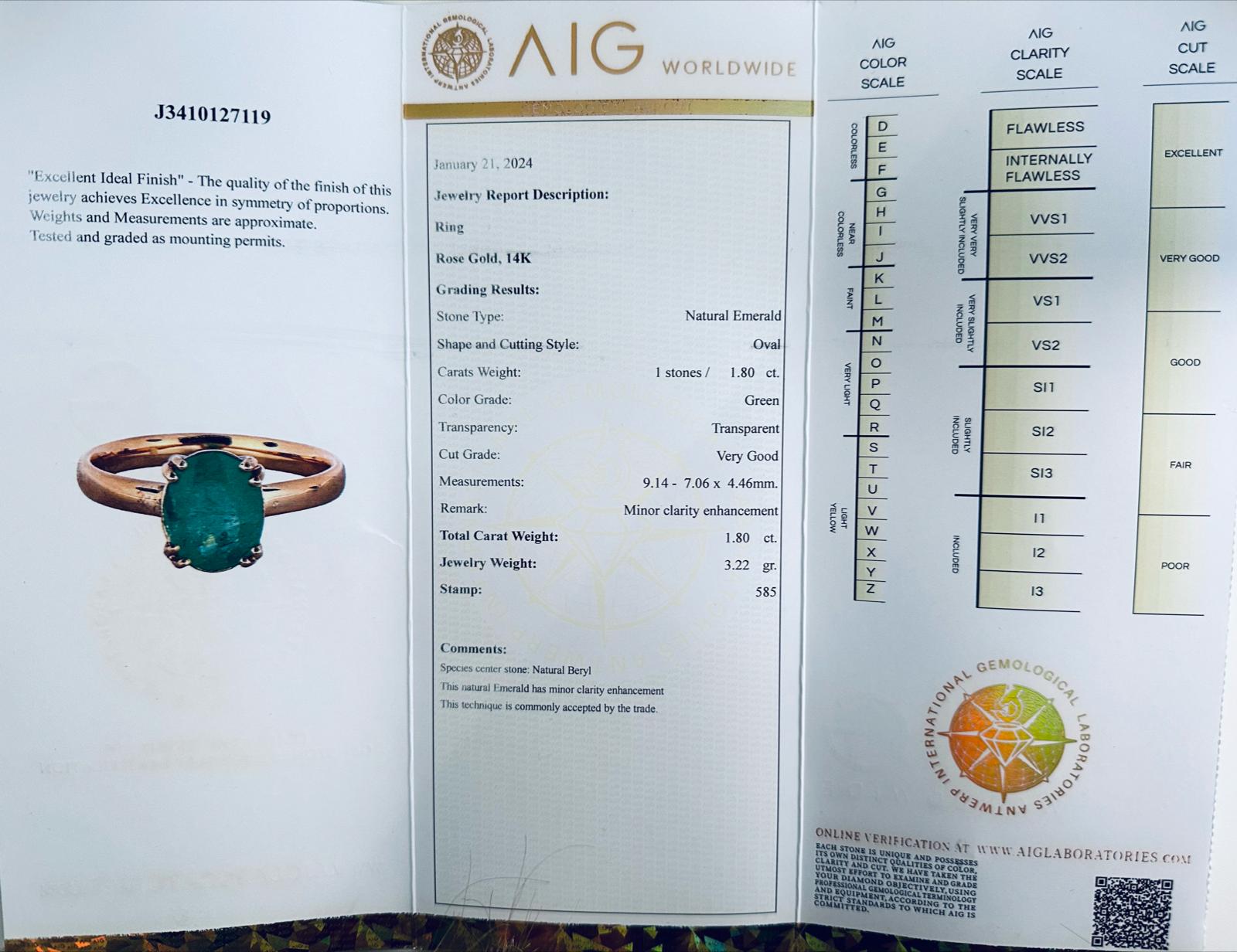 ANELLO IN ORO ROSA 14K 3.22 GR SMERALDO COLOMBIANO 1.80 CARATI TAGLIA 7 - CERTIFICATO AIG - RNG40103