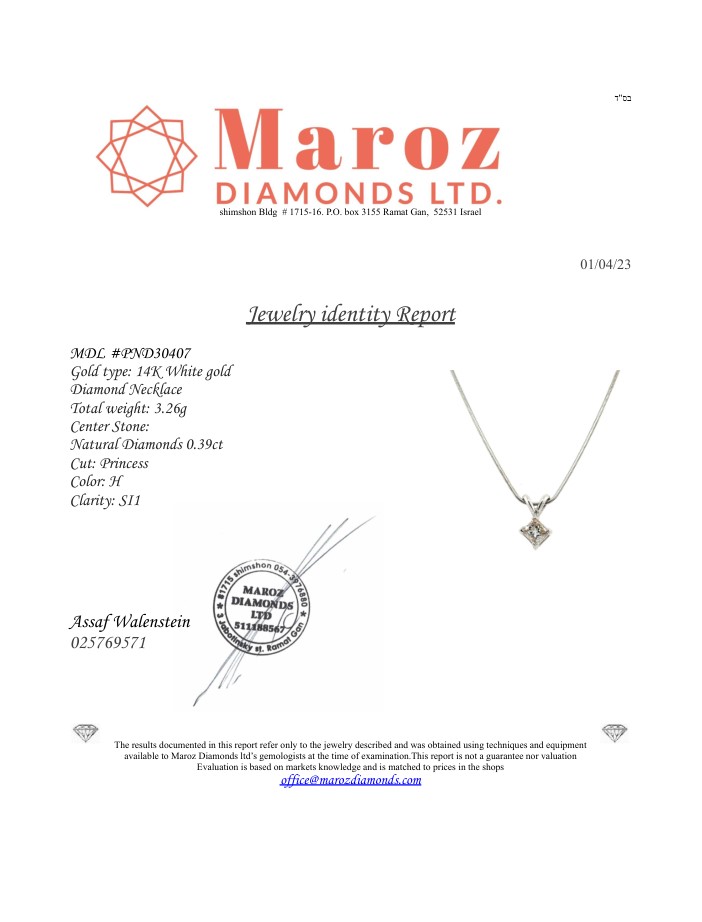 GIROCOLLO IN ORO BIANCO 14K 3.26 GR CON DIAMANTE DA 0.39 CARATI COLORE H PUREZZA SI1 CERTIFICATO GEMMOLOGICO MAROZ DIAMONDS LTD MEMBRO ISRAEL DIAMOND EXCHANGE - PND30407