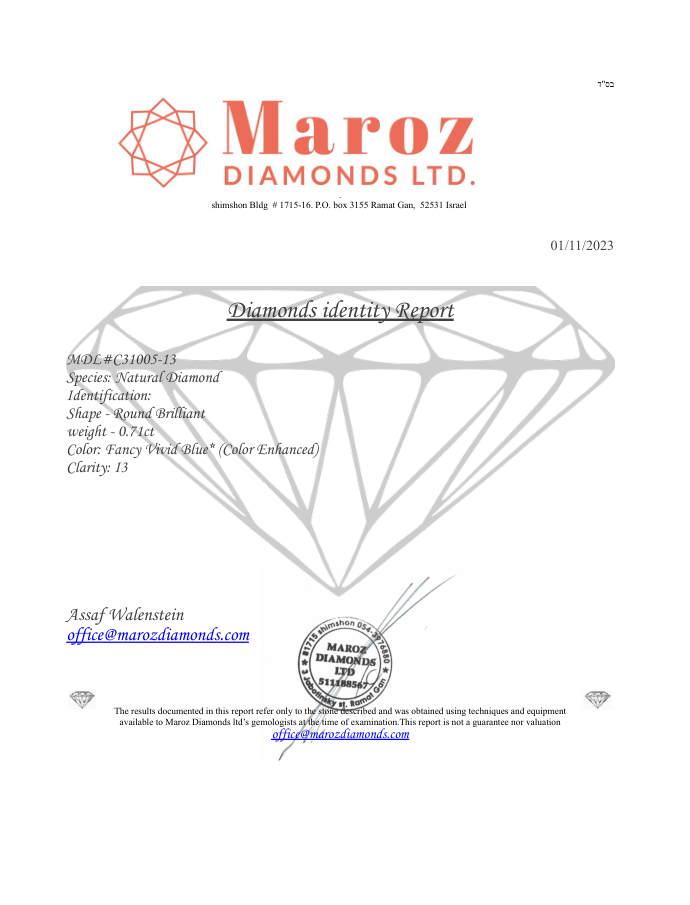 DIAMANTE COLORE ESALTATO 0,71 CARATI COLORE FANCY BLU VIVIDO- PUREZZA I3 - TAGLIO BRILLANTE - CERTIFICATO GEMMOLOGICO MAROZ DIAMONDS LTD MEMBRO ISRAEL DIAMOND EXCHANGE - C31005-13