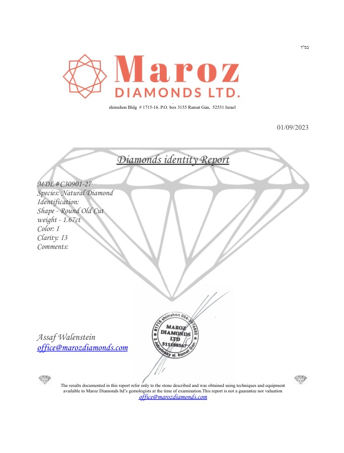 DIAMANTE 1,67 CARATI COLORE I- PUREZZA I3 - TAGLIO BRILLANTE (TAGLIO ANTICO) - CERTIFICATO GEMMOLOGICO MAROZ DIAMONDS LTD MEMBRO ISRAEL DIAMOND EXCHANGE - C30901-27