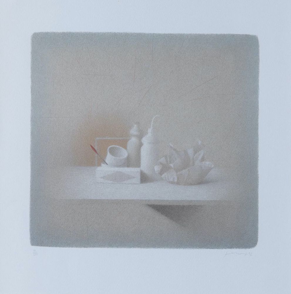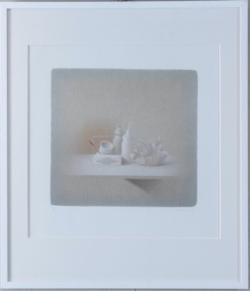 GIANFRANCO FERRONI (Livorno 1927 - Bergamo 2001) "Natura morta", 1992. Litografia su carta. Lastra: cm 30,5x32. Opera firmata in basso a destra Ferroni 92. Reca numeri di tiratura in basso a sinistra 11/150.