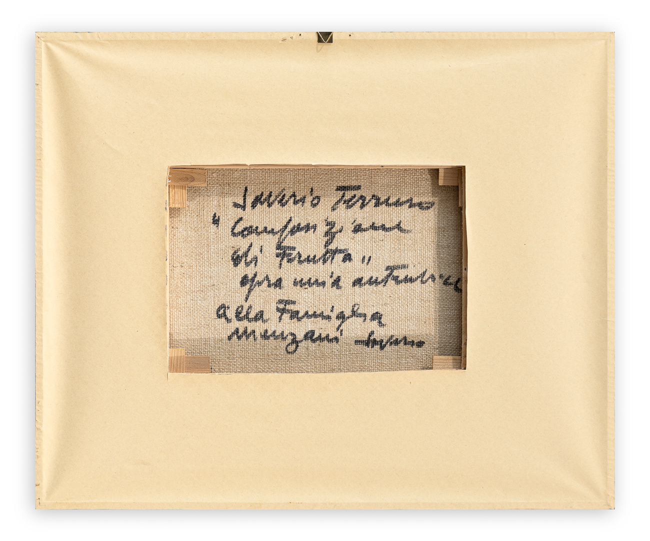 Firma, titolo, dedica ad personas e dichiarazione di autenticità dell'Artista al retro