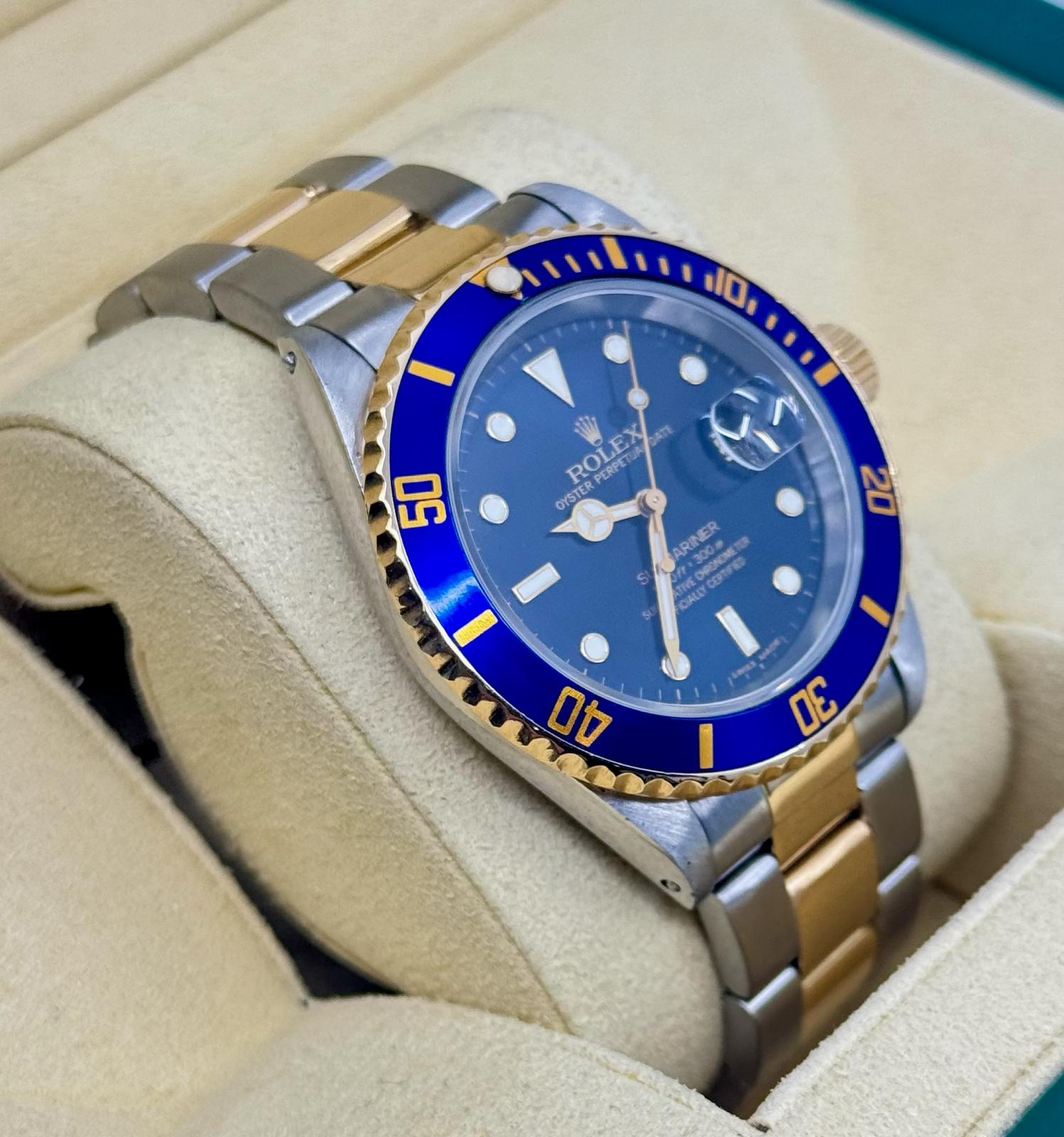 Marca Rolex Modello (Orologio) Submariner Date Numero di referenza 16613 Carica Automatico Materiale della cassa Oro/Acciaio Materiale cinturino Oro/acciaio Anni 90 Condizione Ottimo (di seconda mano, segni di usura assenti o appena visibili) Corredo documenti originali, senza scatola originale Cassa Materiale della cassa Oro/Acciaio Diametro 40 mm Impermeabile 30 ATM Materiale lunetta Oro giallo Vetro Vetro zaffiro Quadrante Blu Numeri sul quadrante Senza numeri Cinturino Materiale cinturino Oro/acciaio Colore cinturino Oro/acciaio Chiusura Déployante Funzioni Data