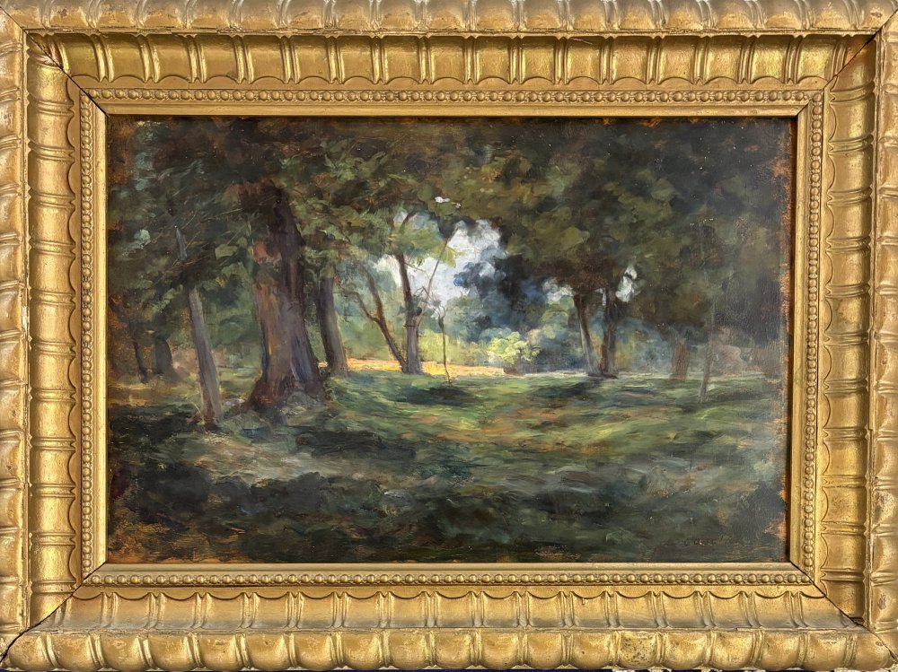 Demetrio Cosola San sebastiano Po (TO) 1851 - Chivasso 1895 Paesaggio boschivo Olio su tavola cm 27,5x42,5 firmato in basso a dx