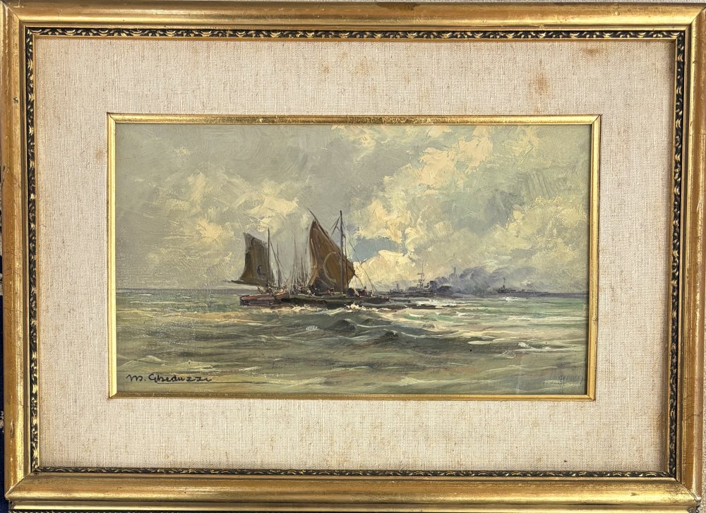 Mario Gheduzzi Crespellano (BO) - Torino 1970 Barconi e navi da guerra al largo di Taranto Olio su tavoletta cm 18x29,5 firmato in basso asx