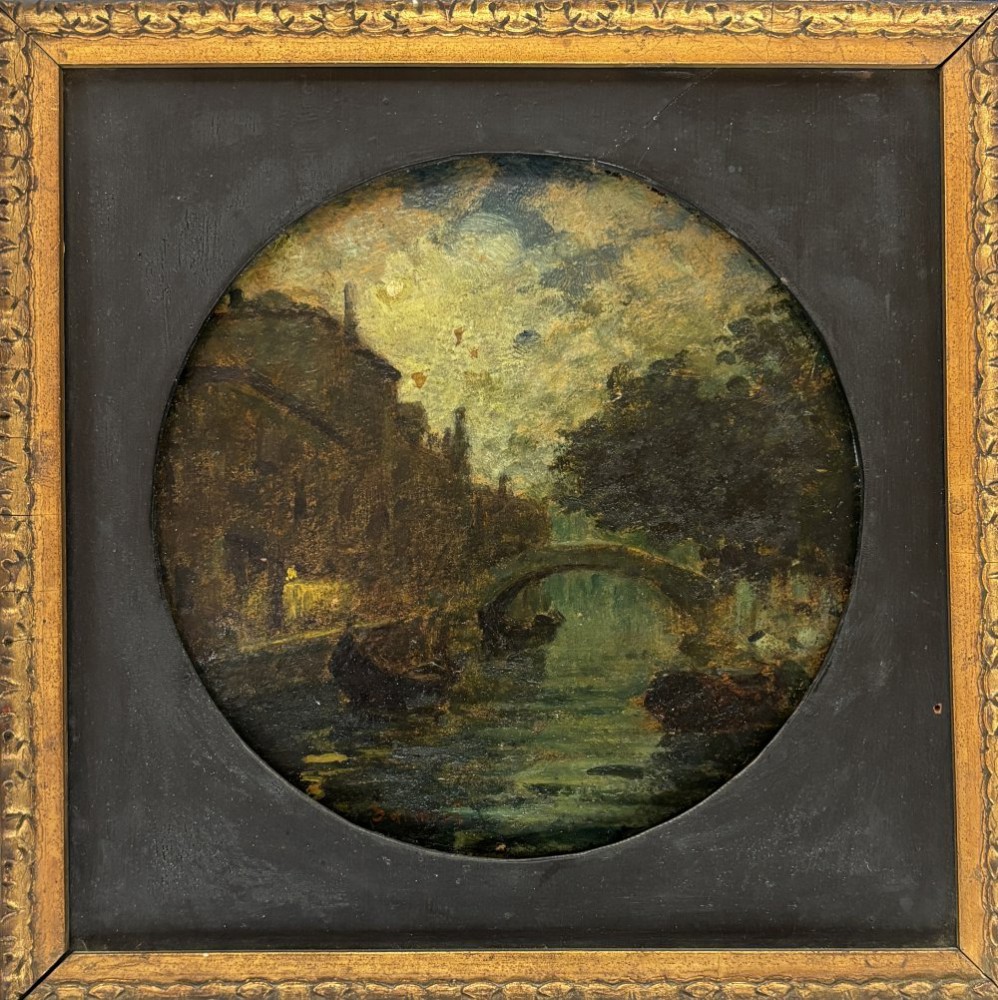 Emilio Salmini Venezia 1861 - Genova 1942 Notturno a Venezia Olio su cartone diametro cm 17,5 firmato in basso a sx