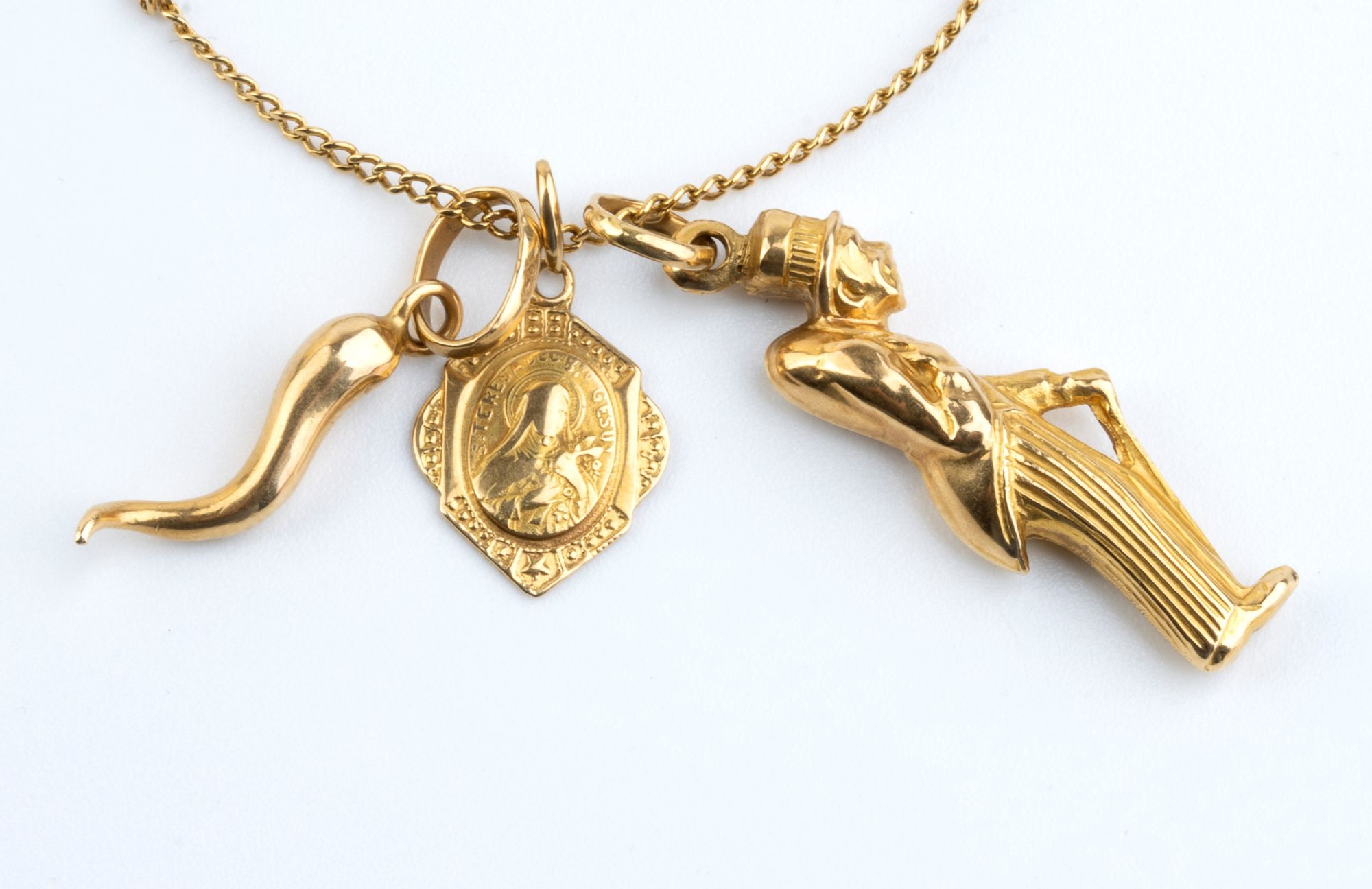 in oro giallo 18k, un pendente a corno della lunghezza di 2,5 cm e punzonato "750", una medaglia raffigurante la Vergine della lunghezza di 2 cm, punzonata "750 - 1 AR", un pendente raffigurante un gobbo della lunghezza di 4 cm e punzonato "750".