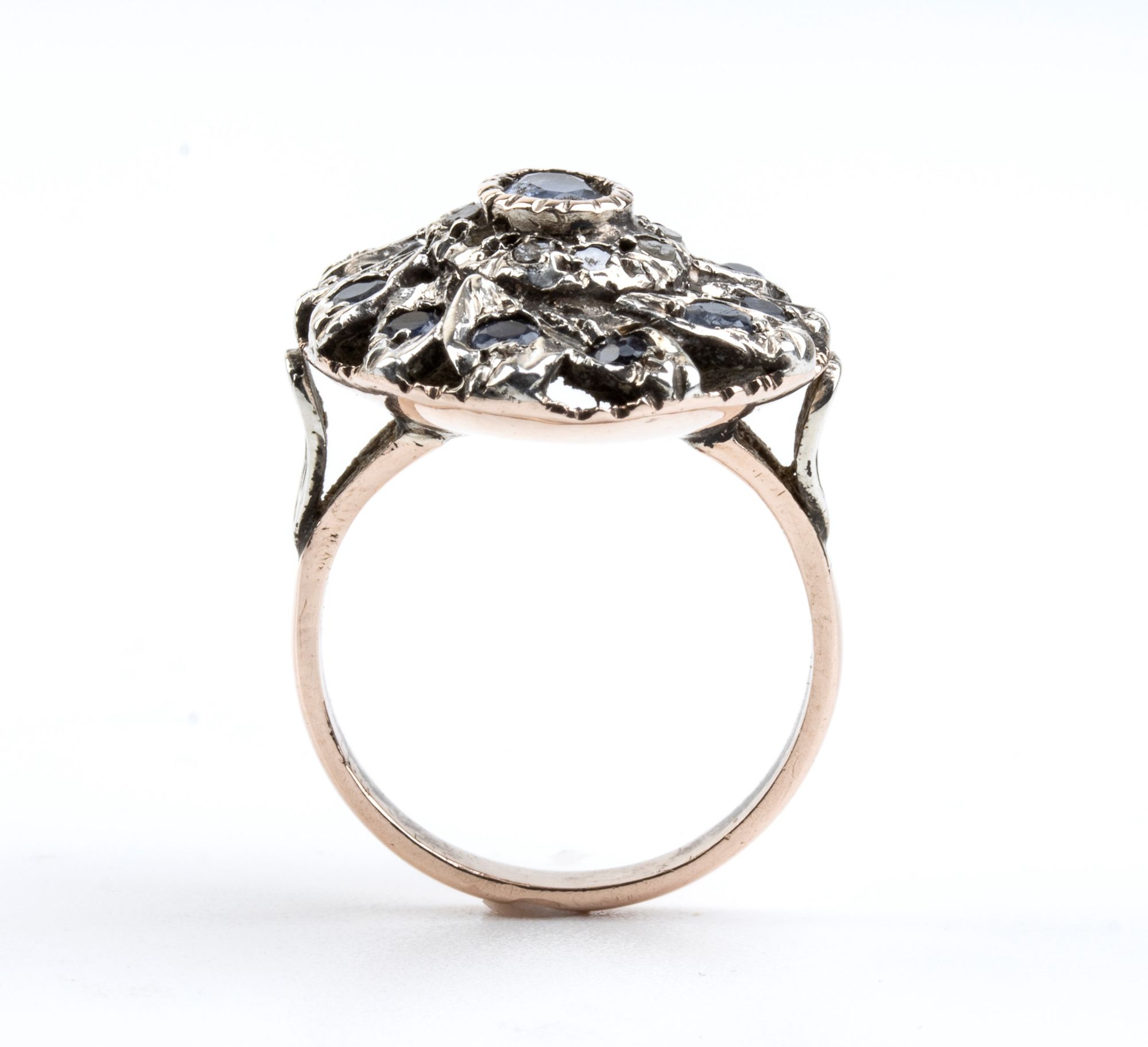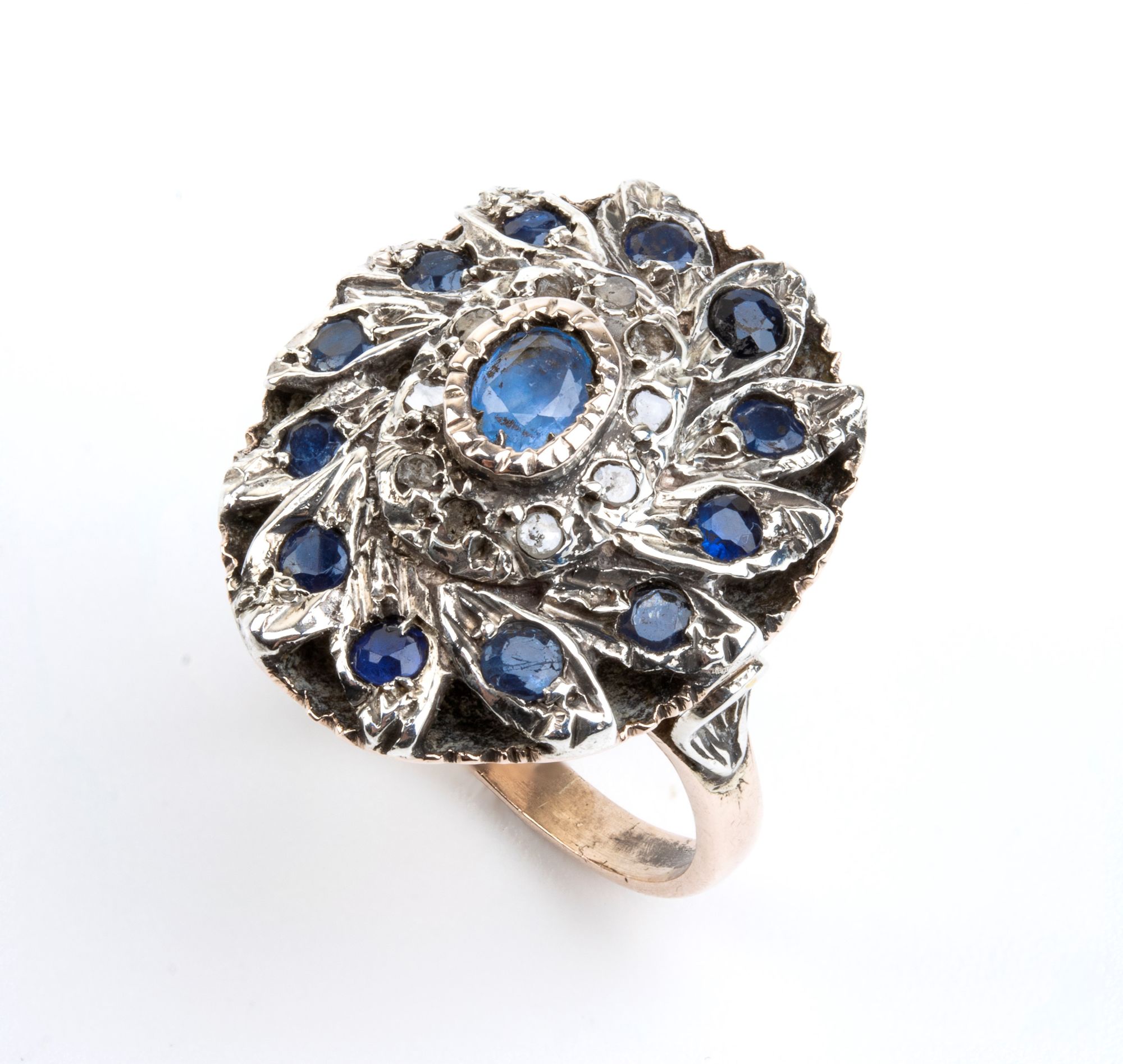 Anello in oro ed argento con zaffiri e diamanti