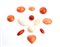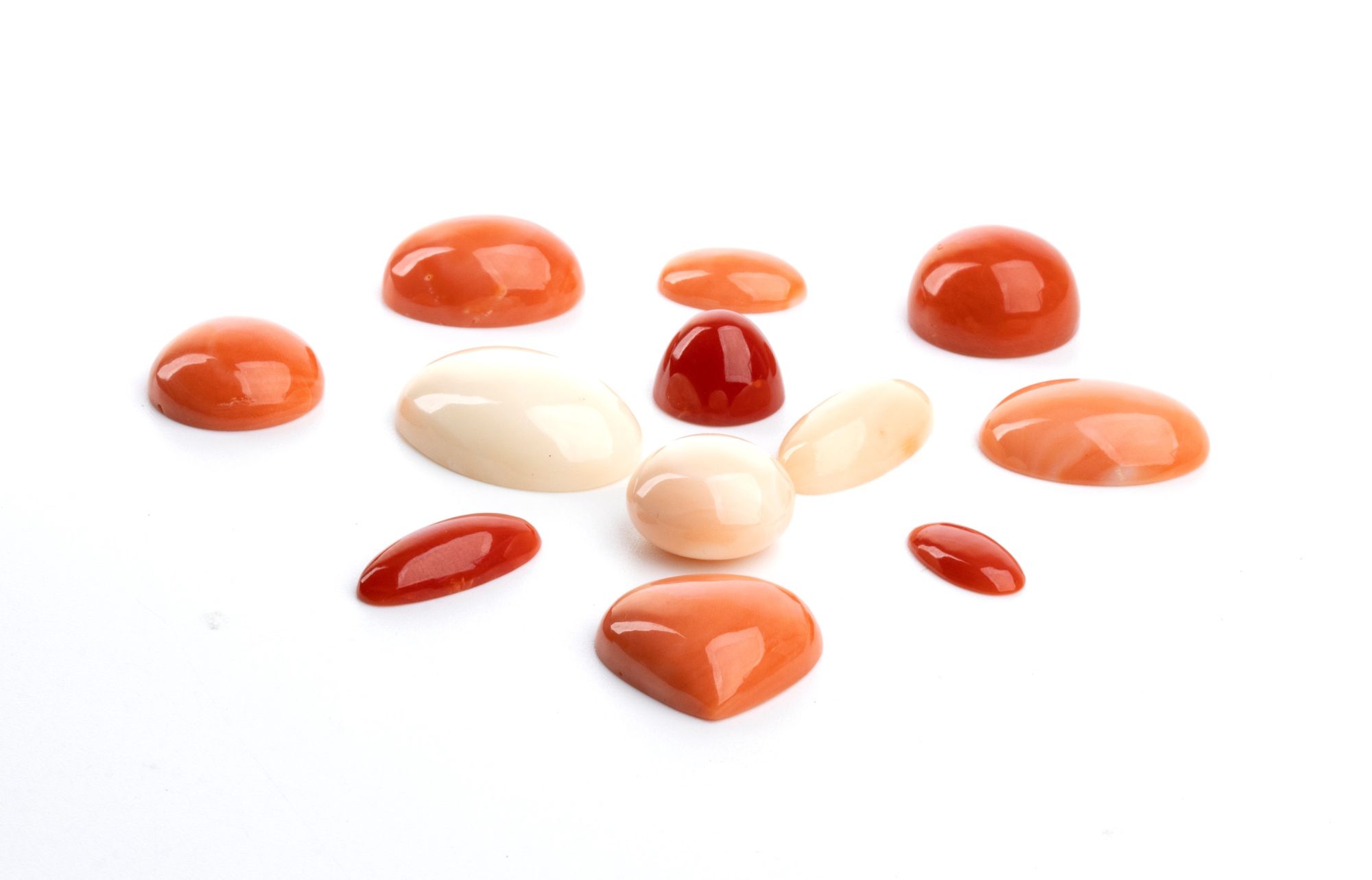 Dimensioni: due cabochon rotondi di corallo cerasuolo 20 x 20 mm cad.; due cabochon ovali rosa 16 x 32 mm cad.; un cabochon rotondo di corallo Mediterraneo 13 x 13 x 10 mm; un cabochon ovale di corallo cerasuolo 23 x 10 mm; un cabochon ovale di corallo Mediterraneo 20 x 5 mm; un cabochon tondo corallo pelle d'angelo 18 x 18 mm; un cabochon ovale corallo pelle d'angelo 28 x 20 mm; un piccolo cabochon ovale corallo Mediterraneo 18 x 4 mm; un piccolo cabochon rosa 18 x 7 mm; un corallo cerasuolo a forma di cuore 20 x 22 mm.