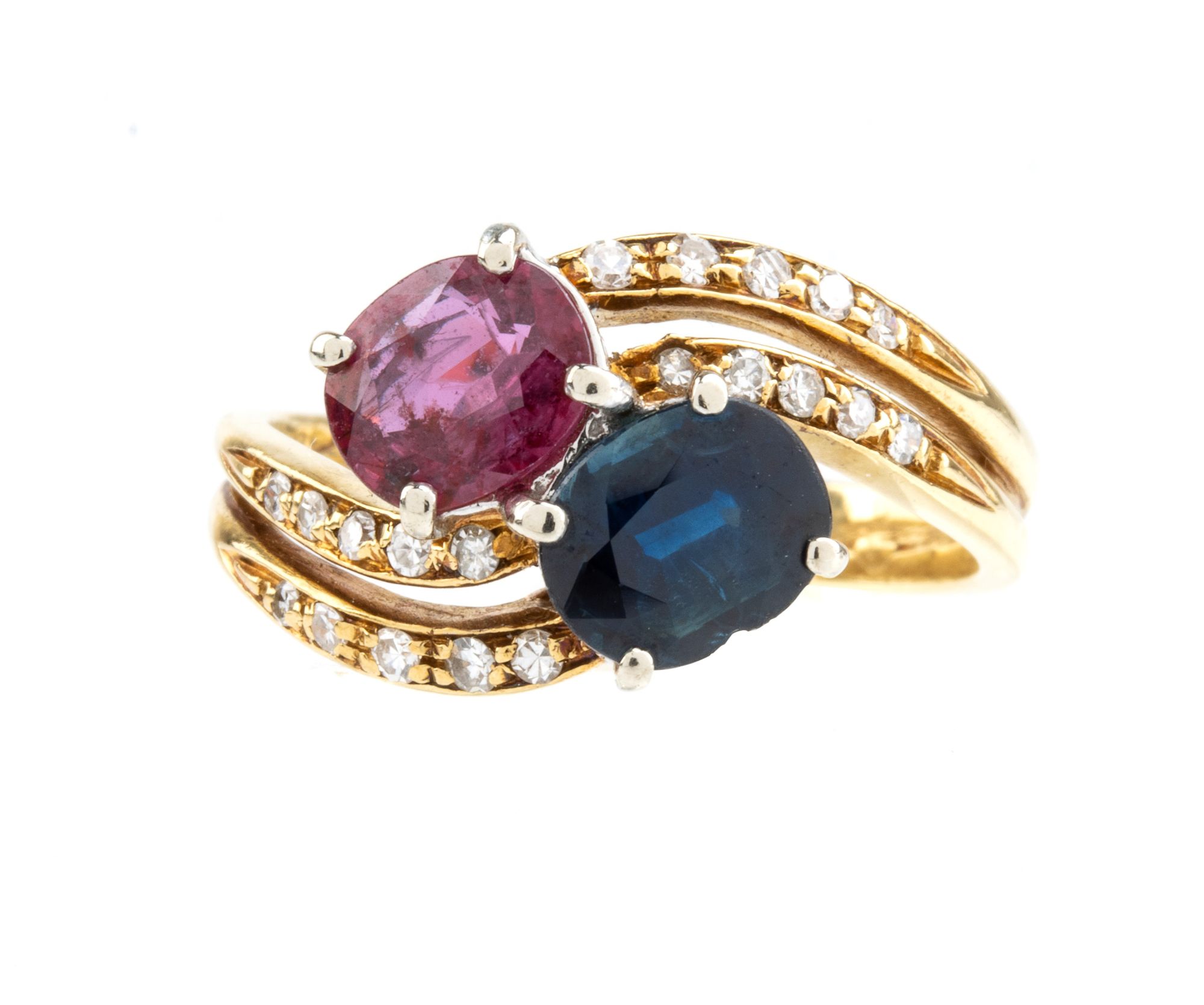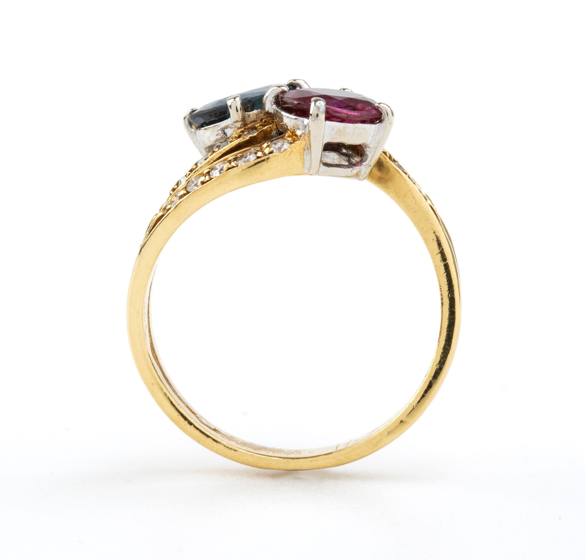 Anello contrariè in oro con rubino, zaffiro e diamanti