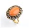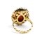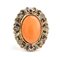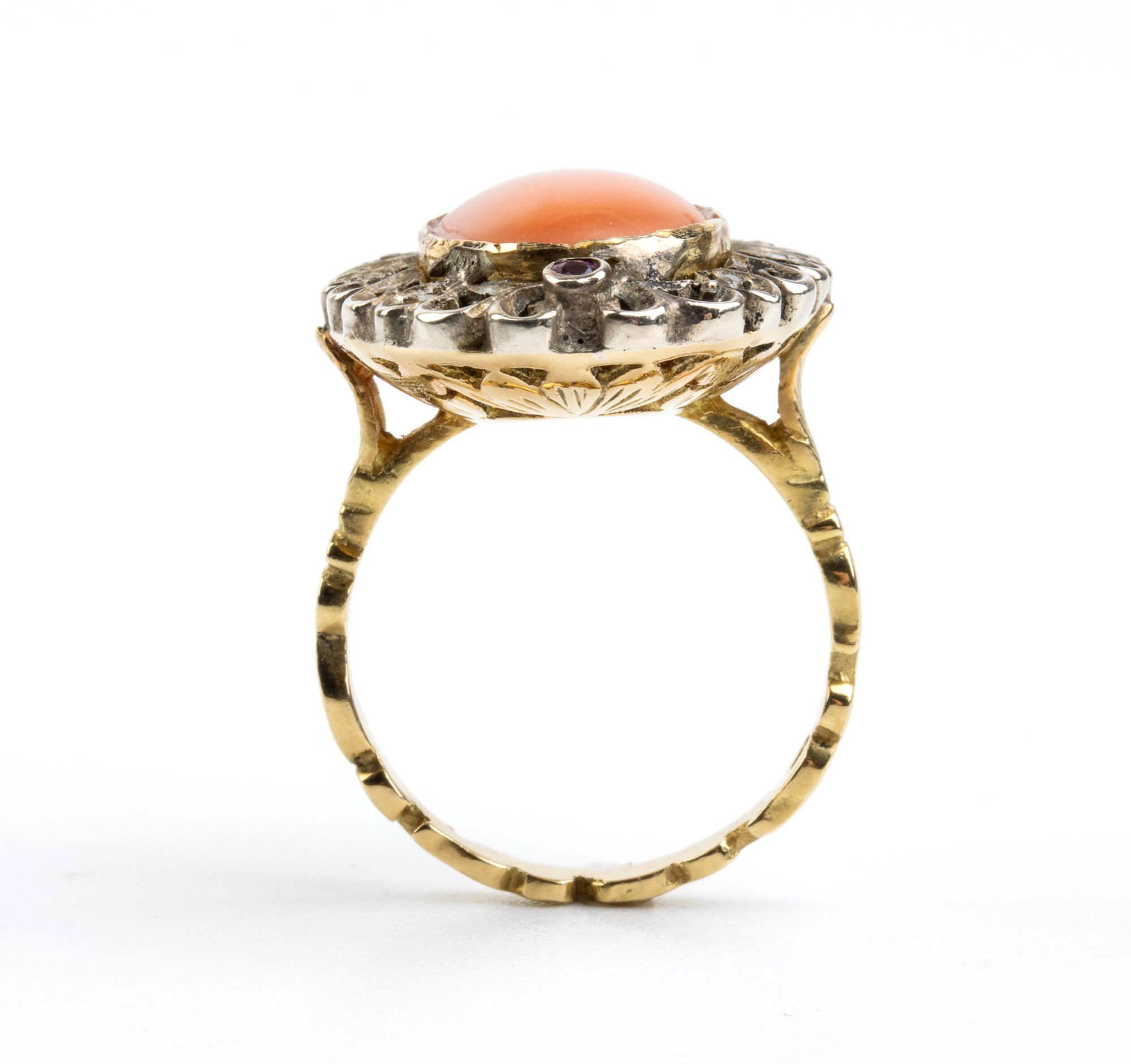montatura a motivo floreale in oro giallo 18k, incastonato con cabochon di corallo cerasuolo (corallium elatius) incorniciato da diamanti tagliato a rosa e rubini.