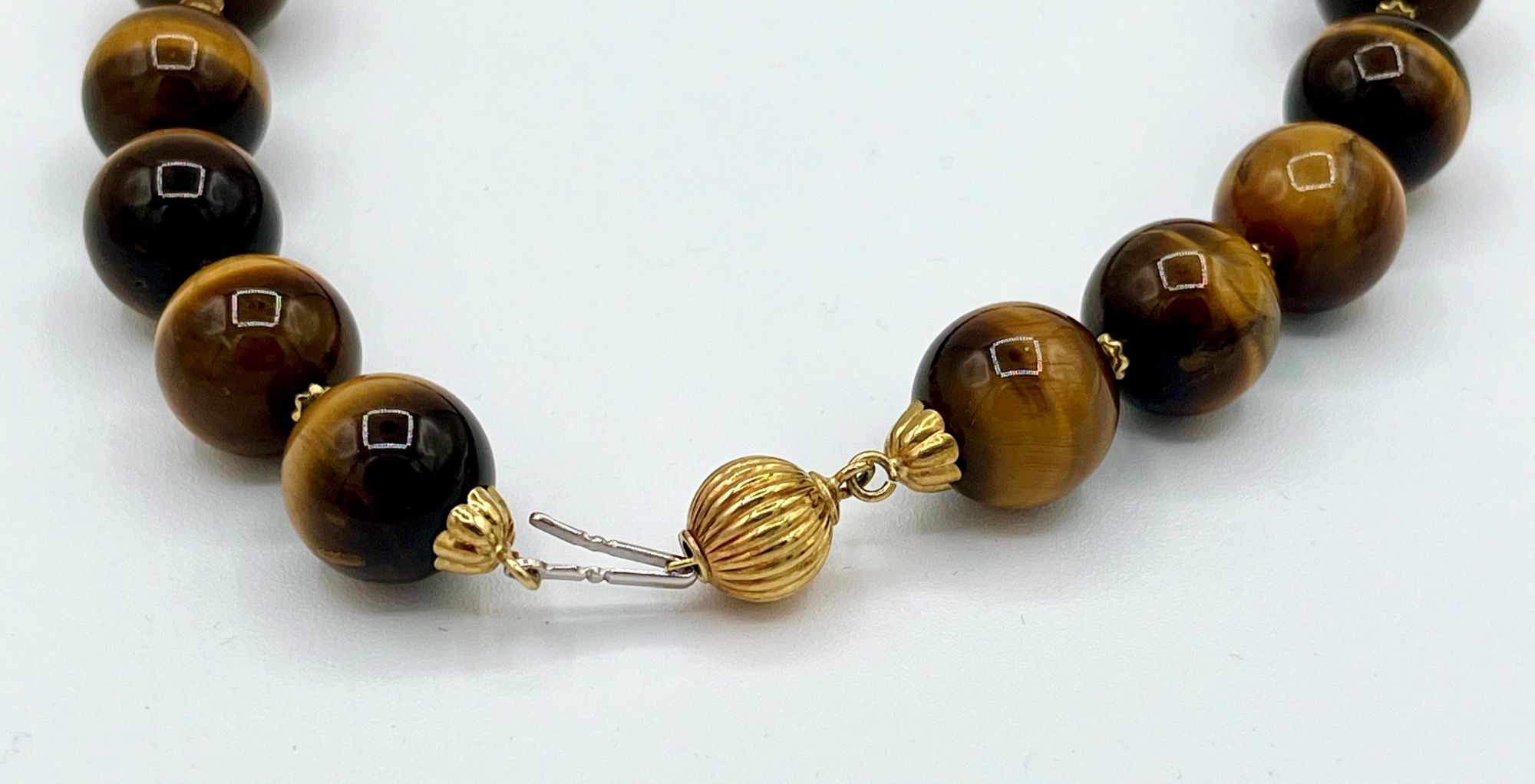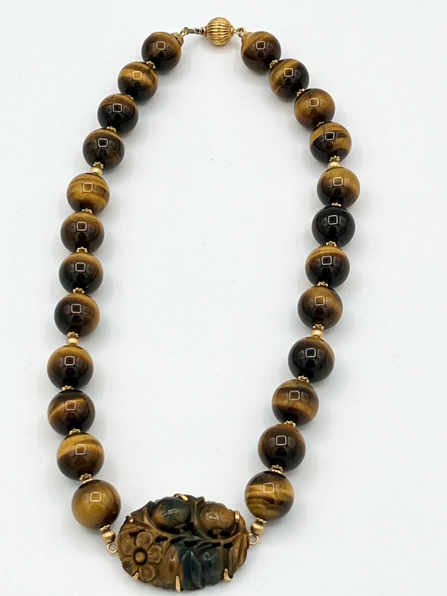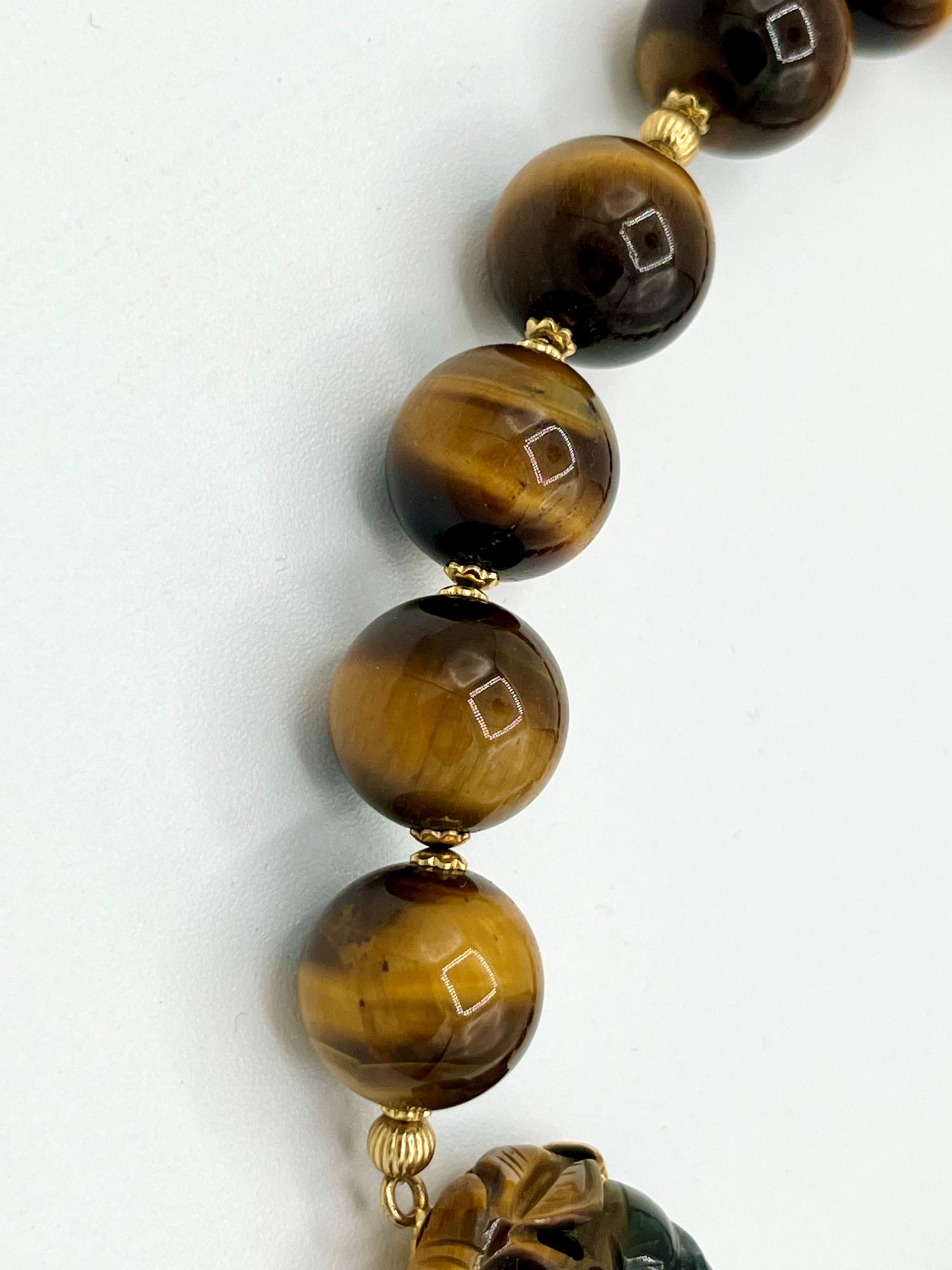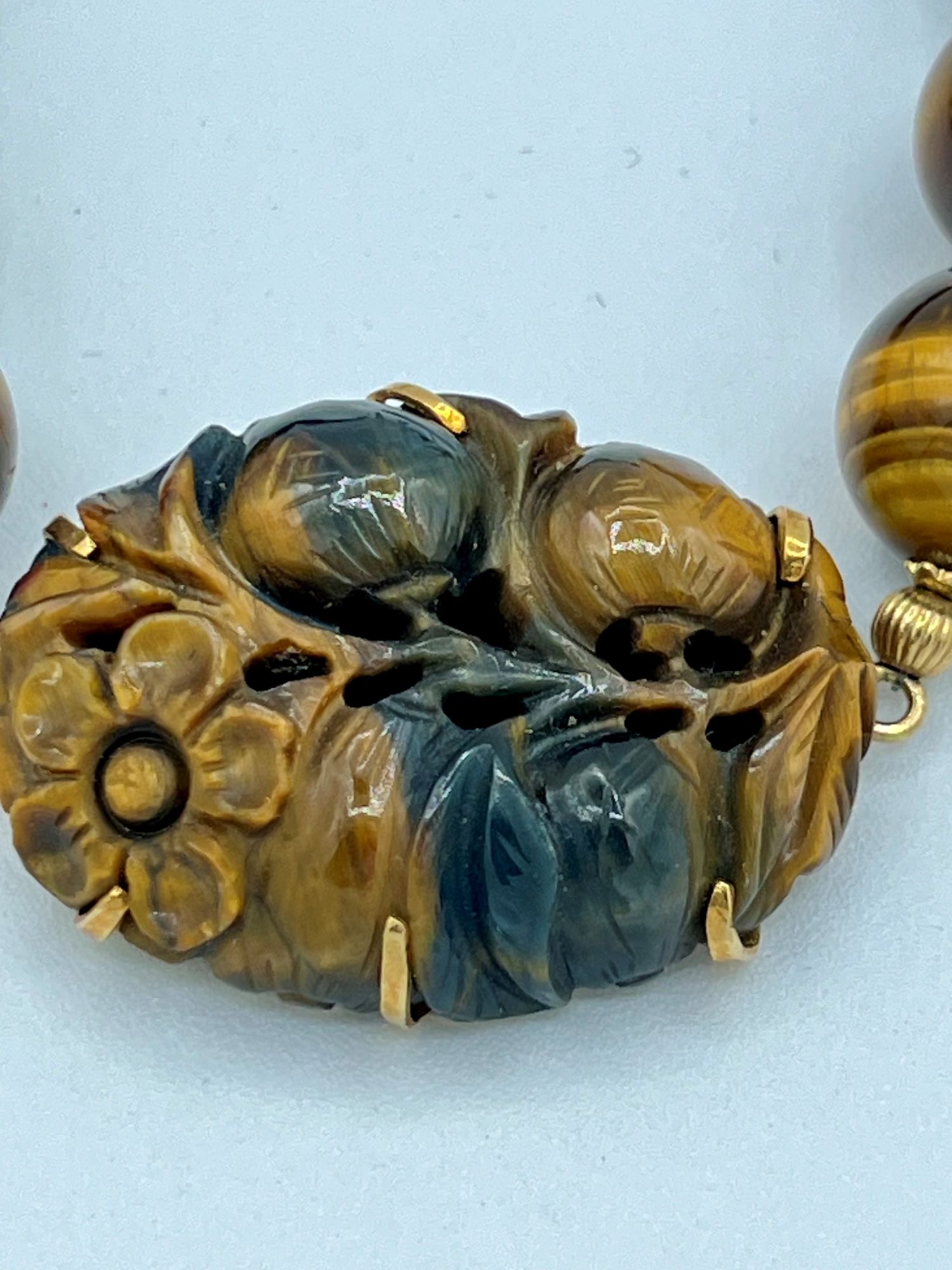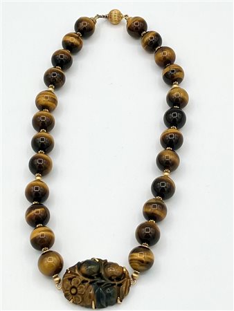 chiusura, distanziali e castone centrale in oro giallo 18k, ad un filo di sfere di quarzo occhio di tigre con centrale scolpito a motivi vegetali.