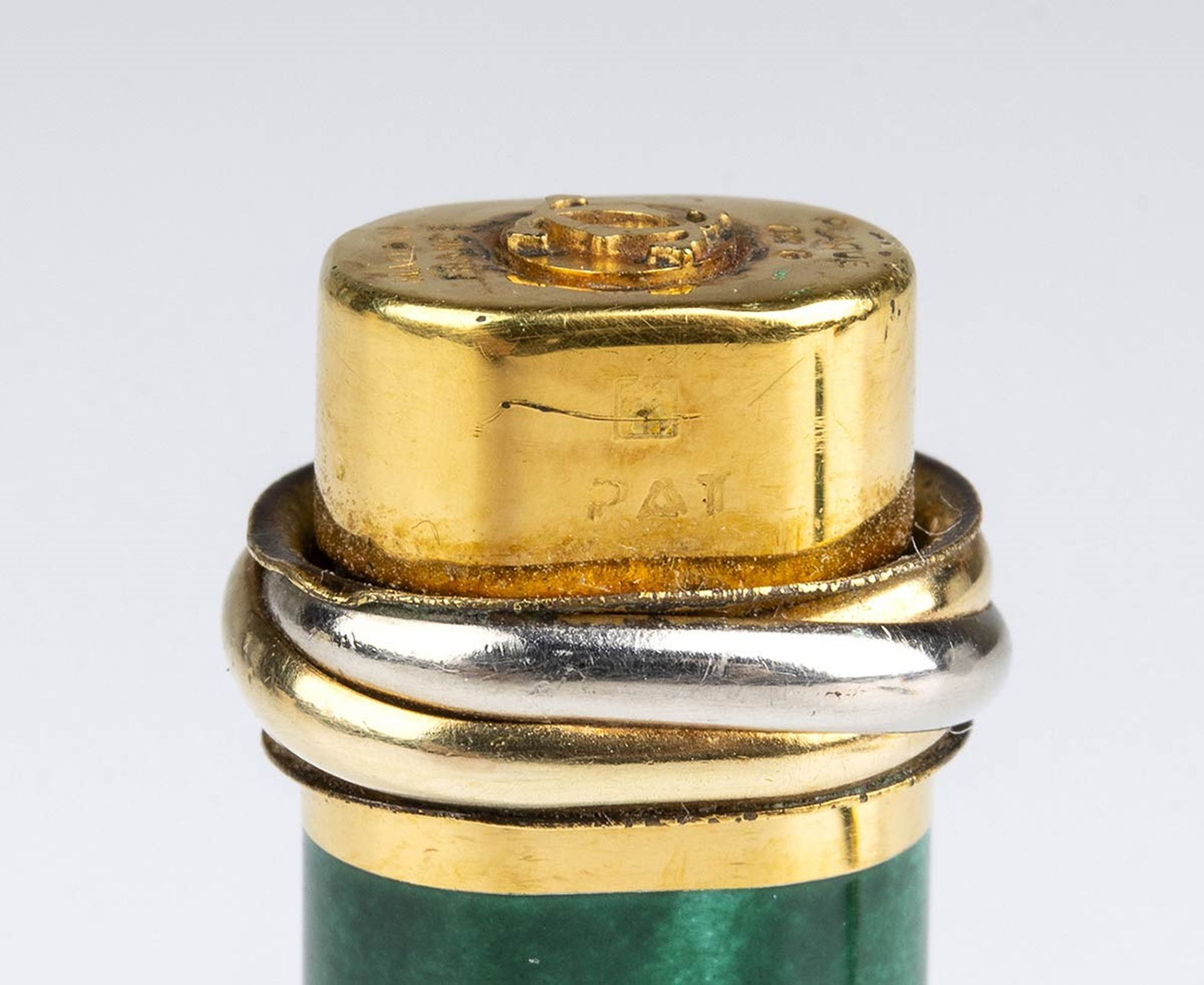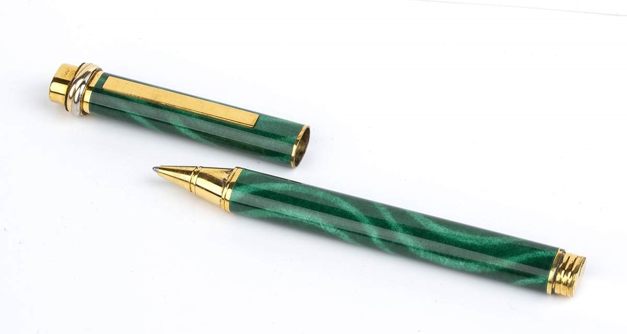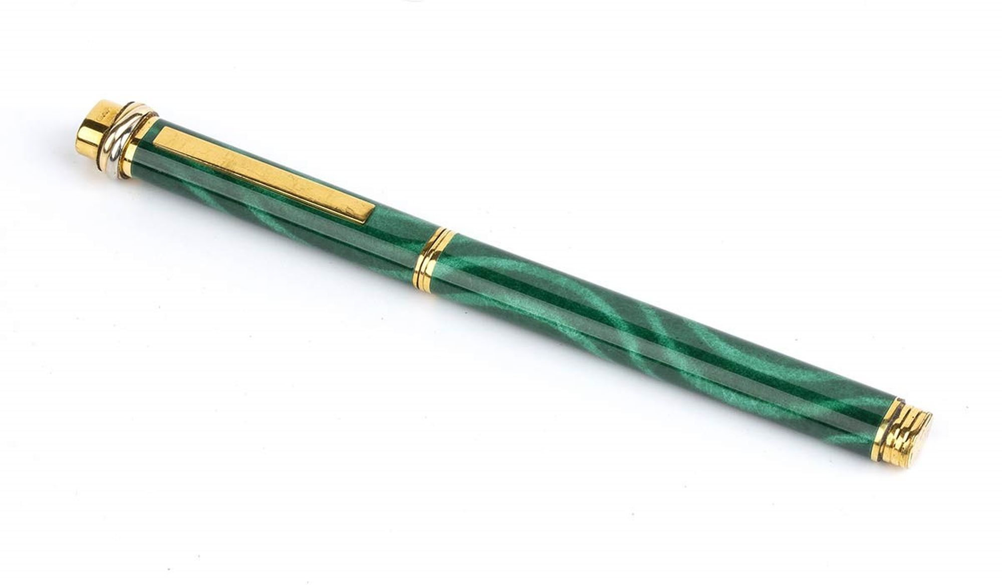 fusto e cappuccio in lacca verde con dettagli placcati in oro; premendo la parte superiore del cappuccio la clip si apre alla larghezza desiderata e rilasciando la pressione la clip ritorna nella sua posizione originale. Numero di serie 685754.