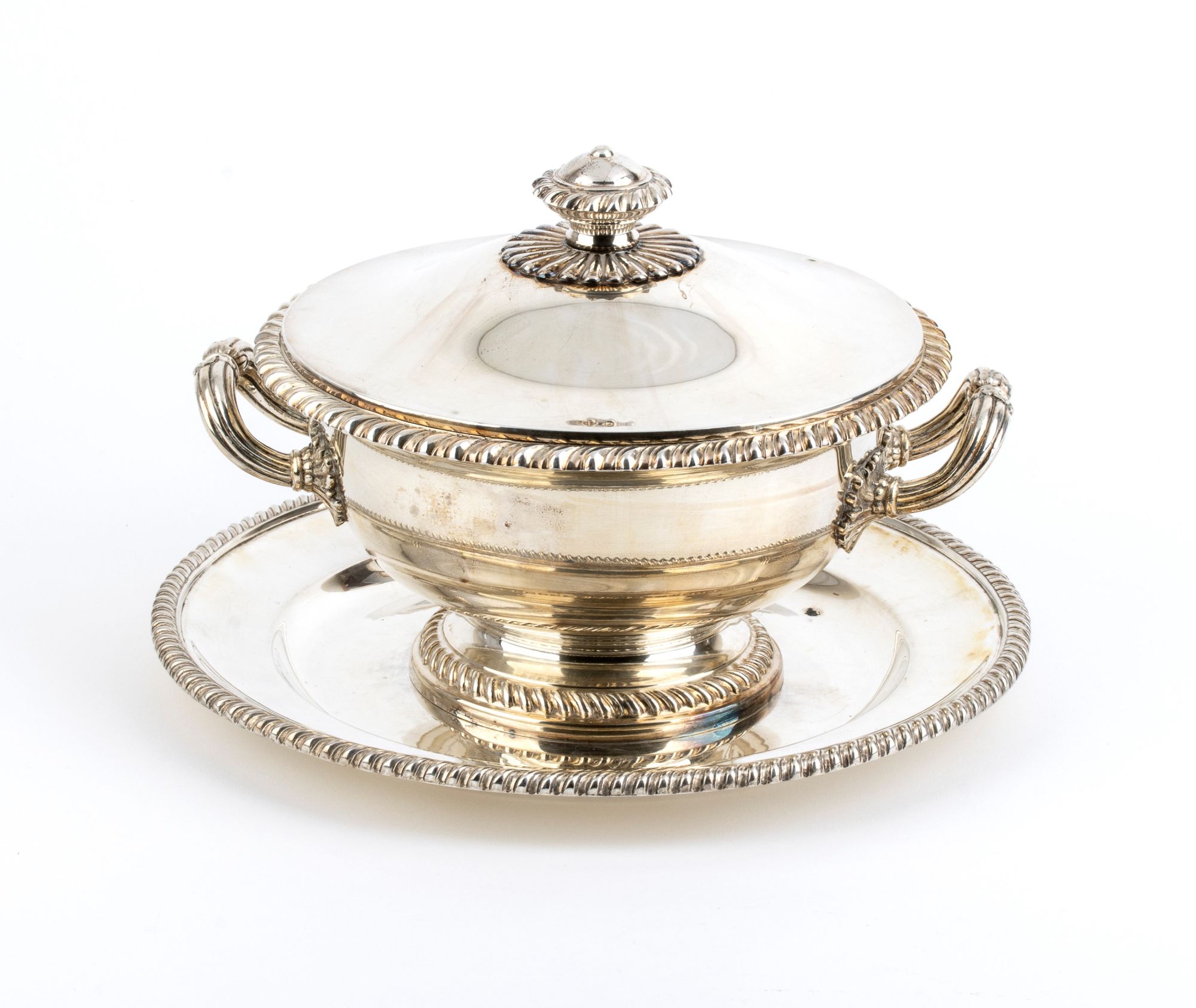Zuppiera in argento con sottopiatto - Italia anni '30, argentiere Miracoli Milano Dimensioni zuppiera 20,5 x 23 x 23 cm; dimensioni sottopiatto 30 x 30 cm. Peso complessivo 2414 gr.