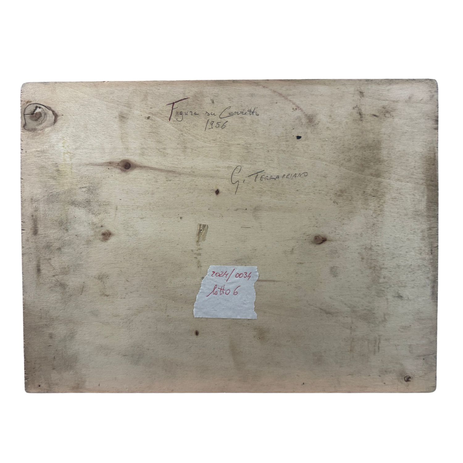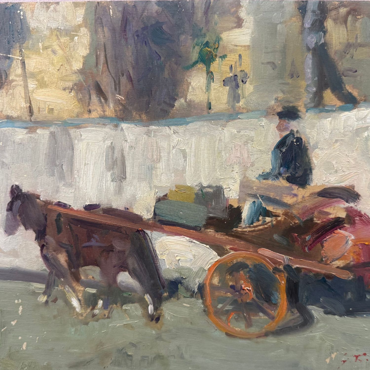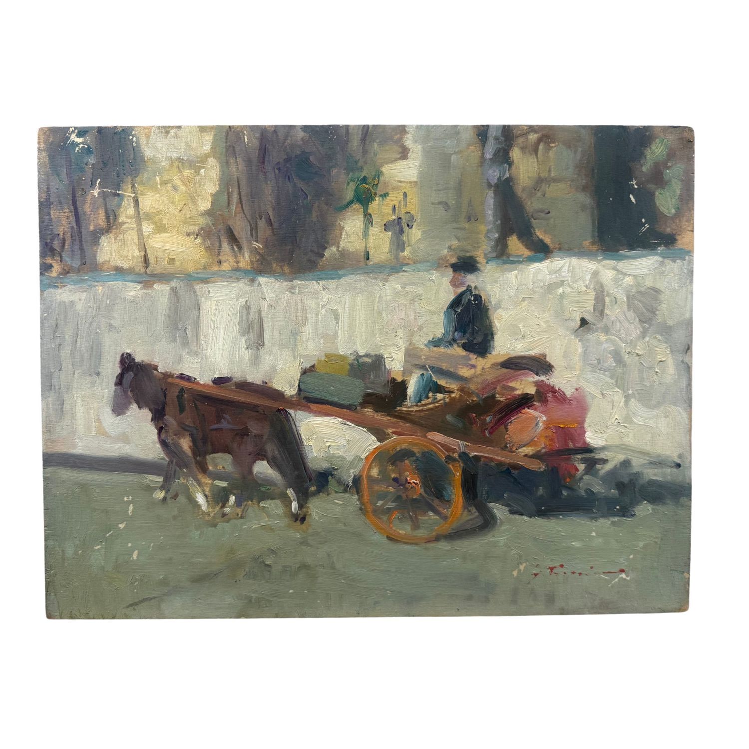 Dipinto olio su tavoletta, periodo XX secolo scuola Italiana, raffigurante Figura su carretto.