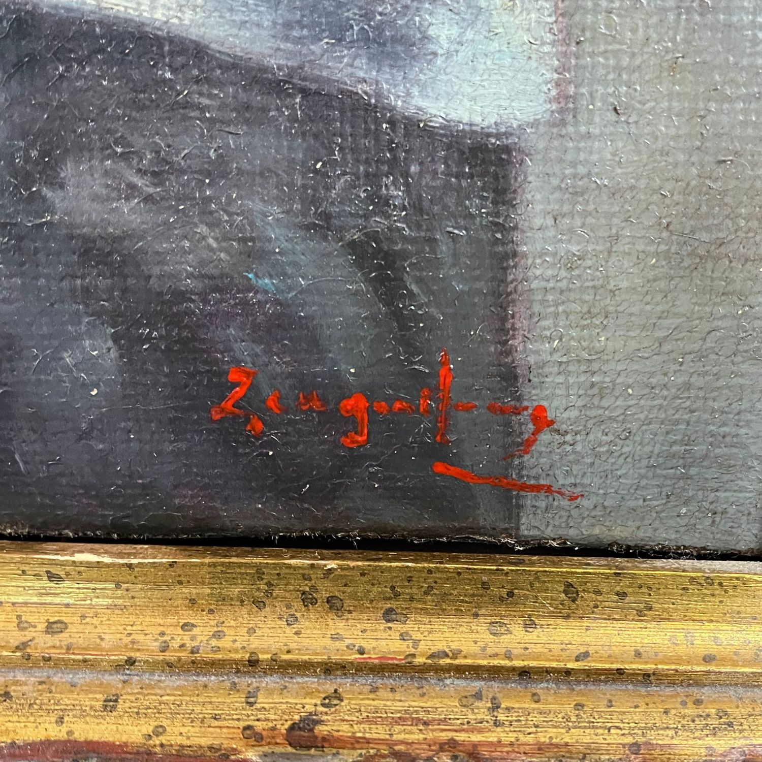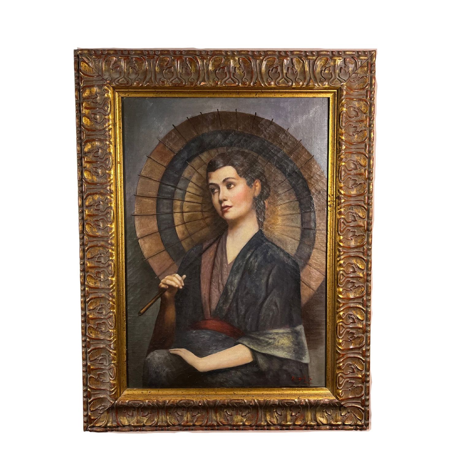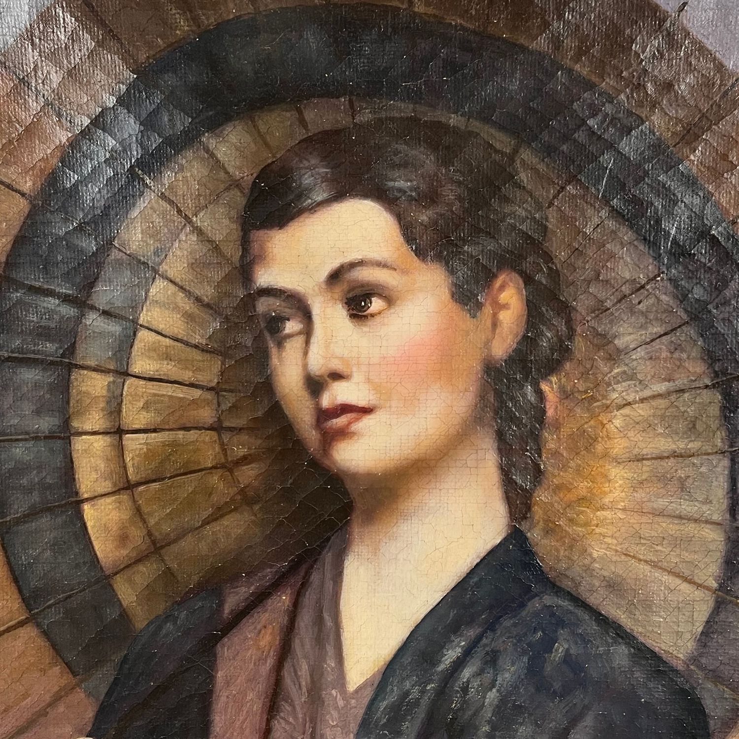Dipinto olio su tela, periodo XX secolo, raffigurante Donna con ombrellino.