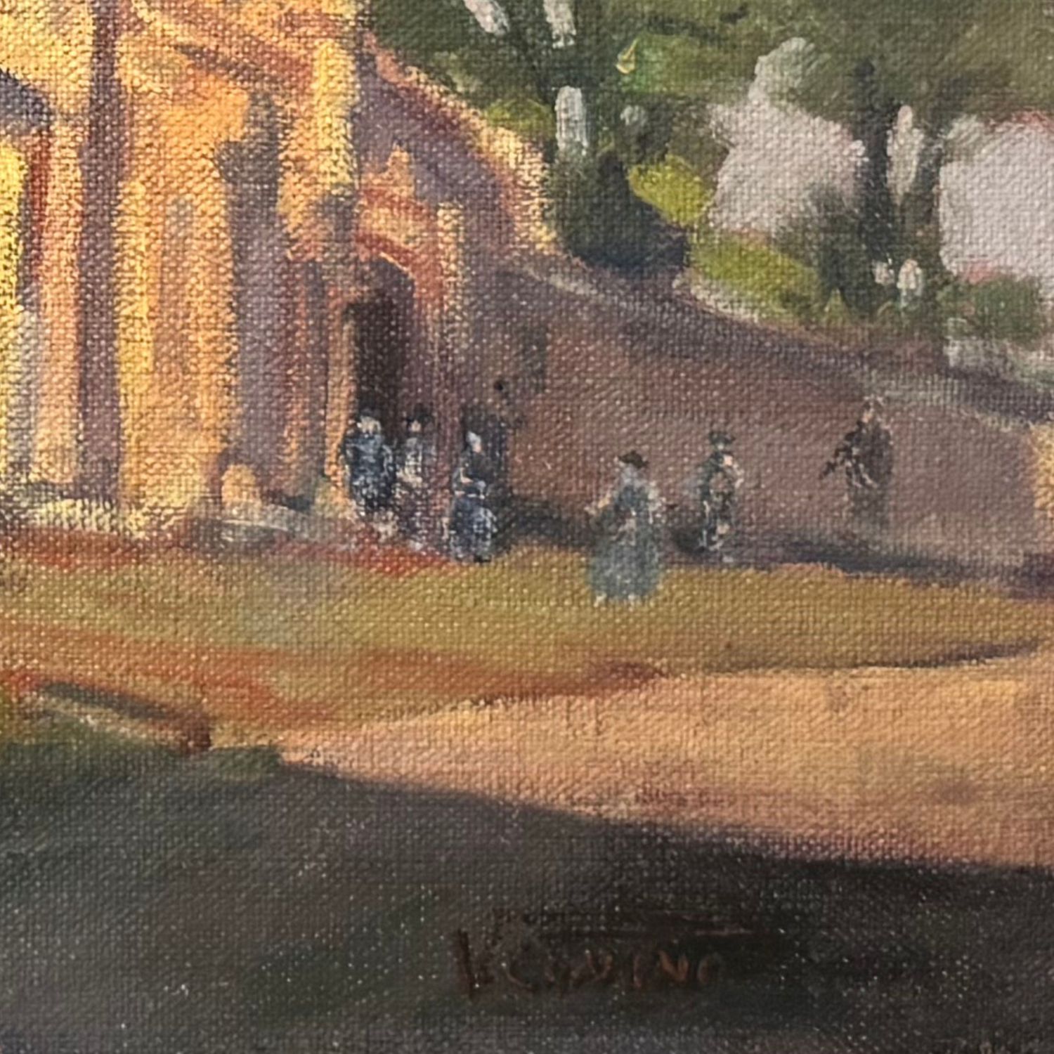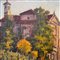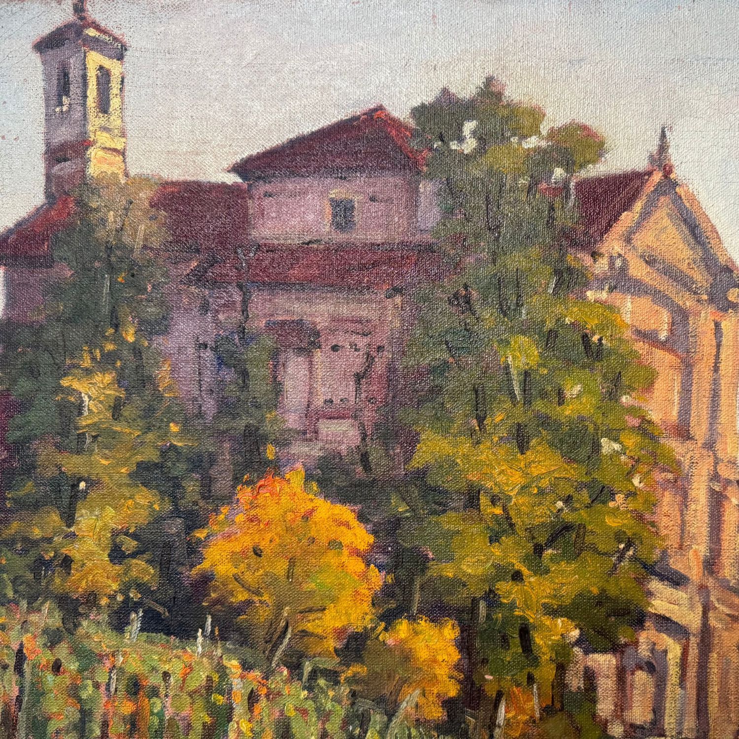 Dipinto olio su tela, periodo XX secolo, scuola Italiana raffigurante Chiesa con paesaggio.
