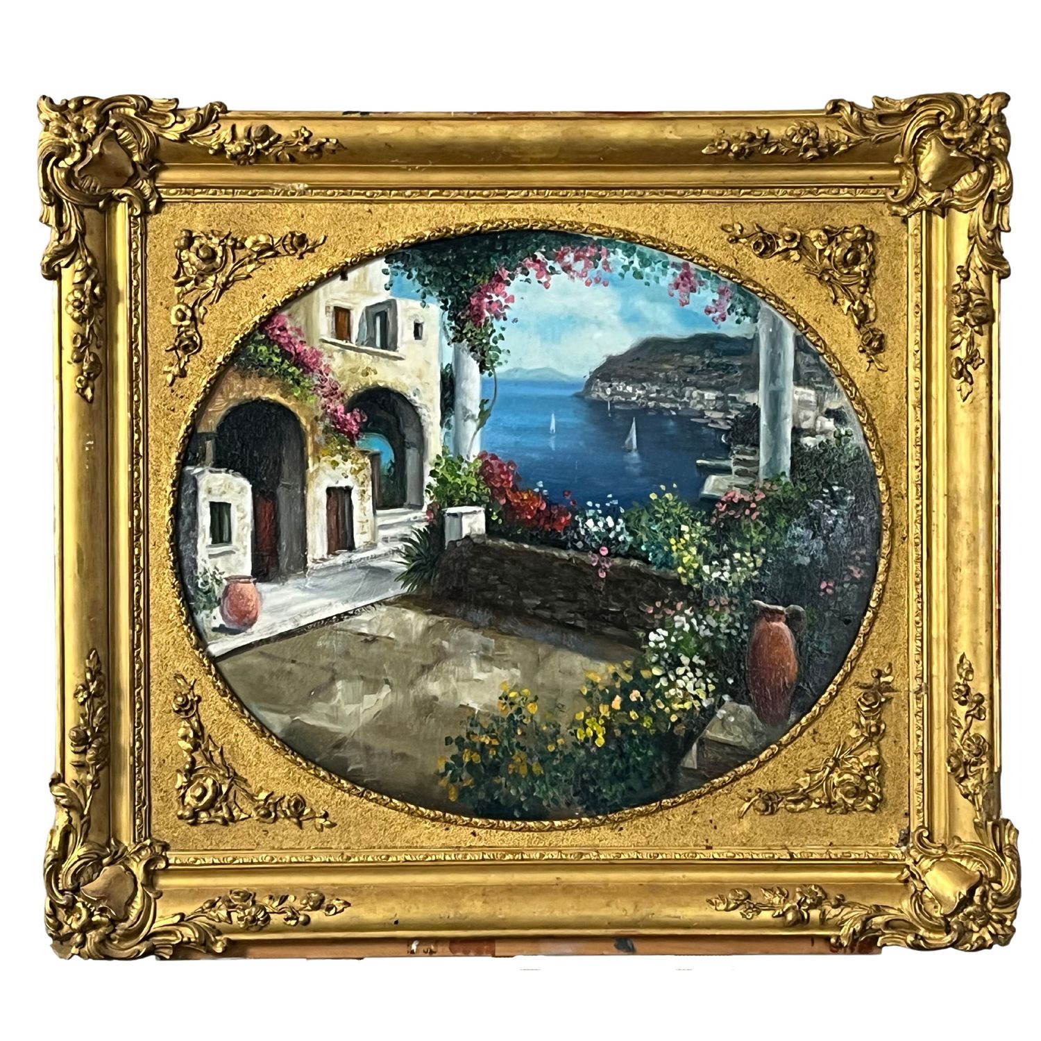 Dipinto olio su cartoncino, di forma ovale, raffigurante Veduta di Costiera da una terrazza. Scuola Italiana XX secolo. Artista anonimo.