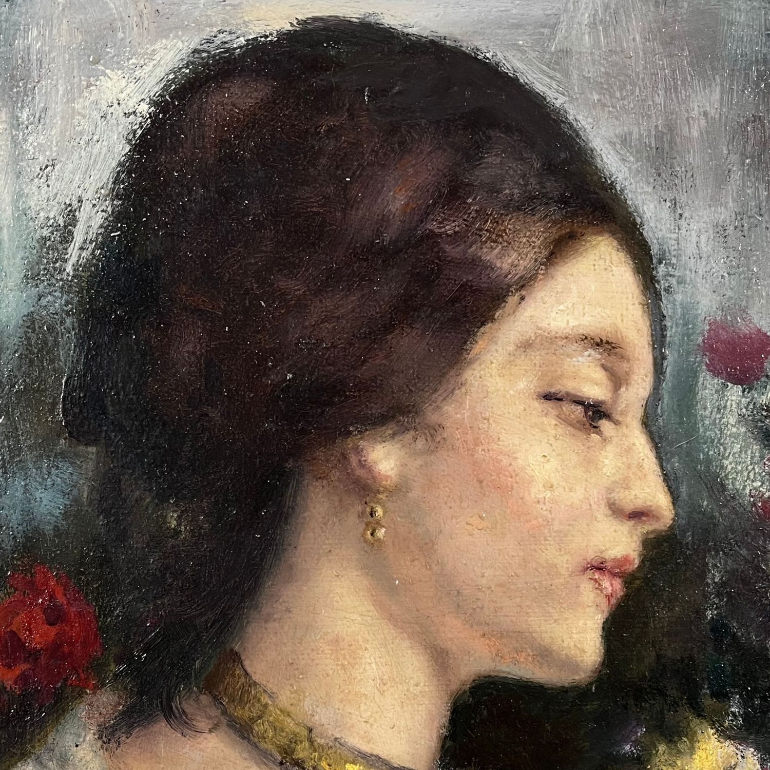 Dipinto olio su tela periodo XX secolo scuola Italiana raffigurante Ritratto di donna con fiori.