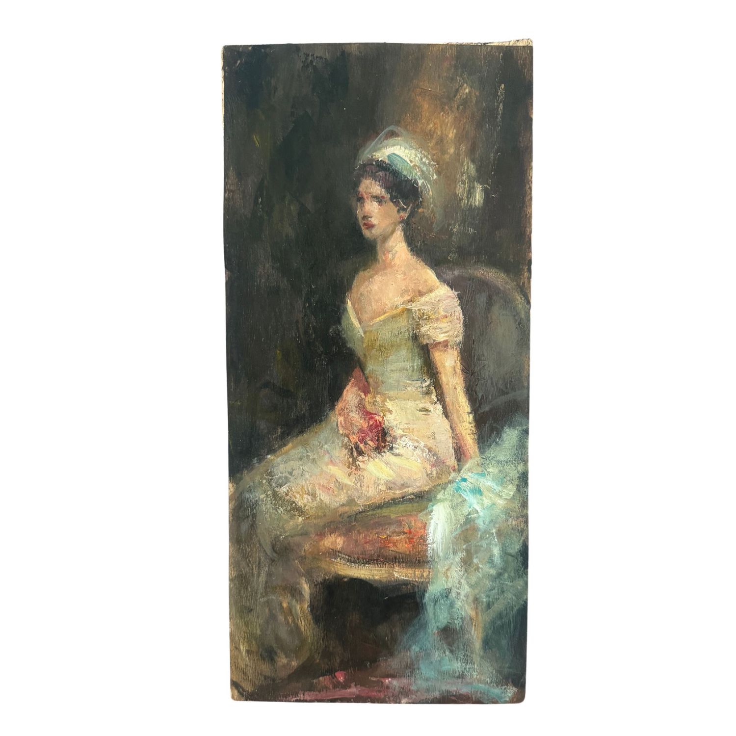 Dipinto olio su tavola, periodo XX secolo scuola Italiana, raffigurante Elegante ritratto donna seduta.