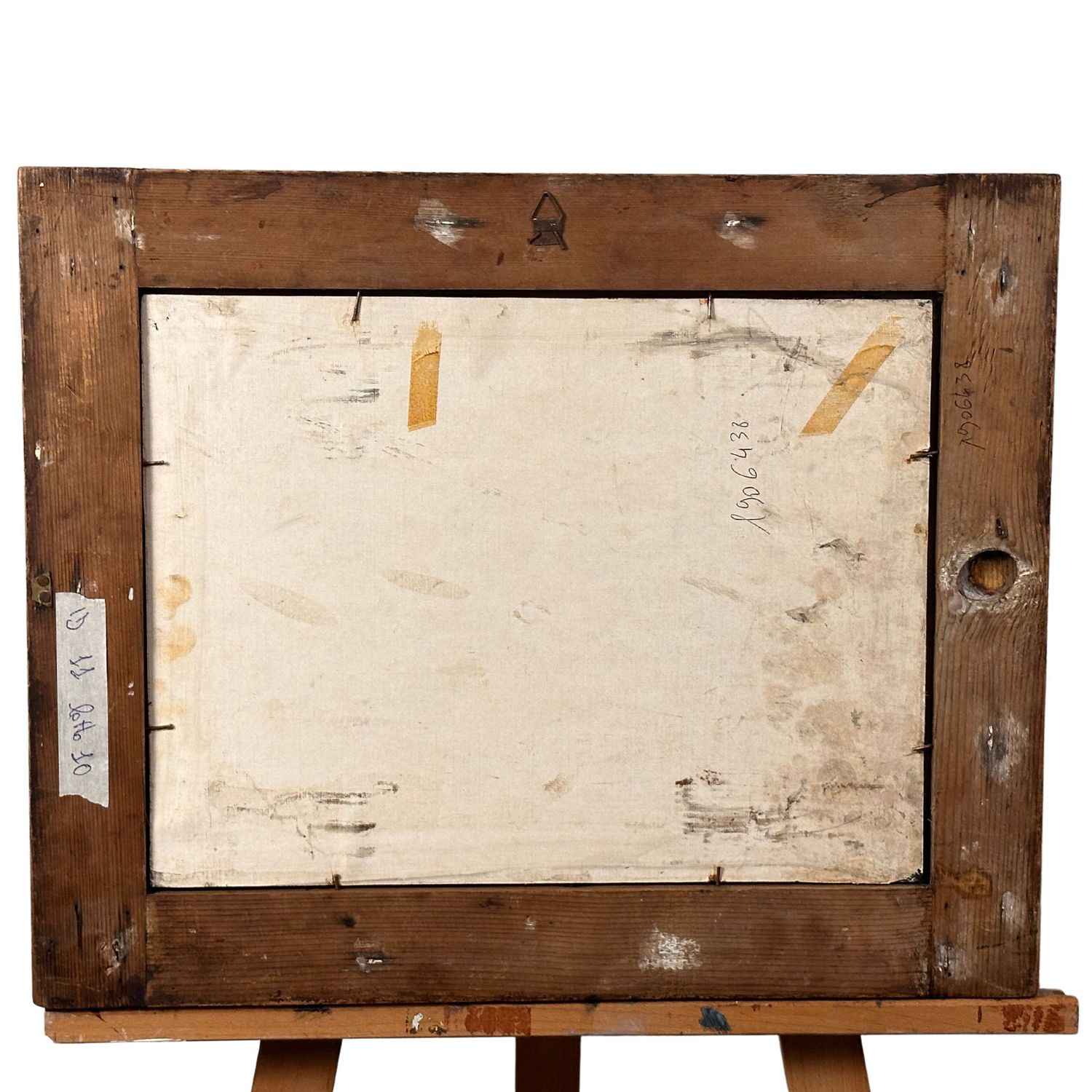 Dipinto olio su tavola del XX secolo di scuola continentale , raffigurante il poliamore , firma non identificata.