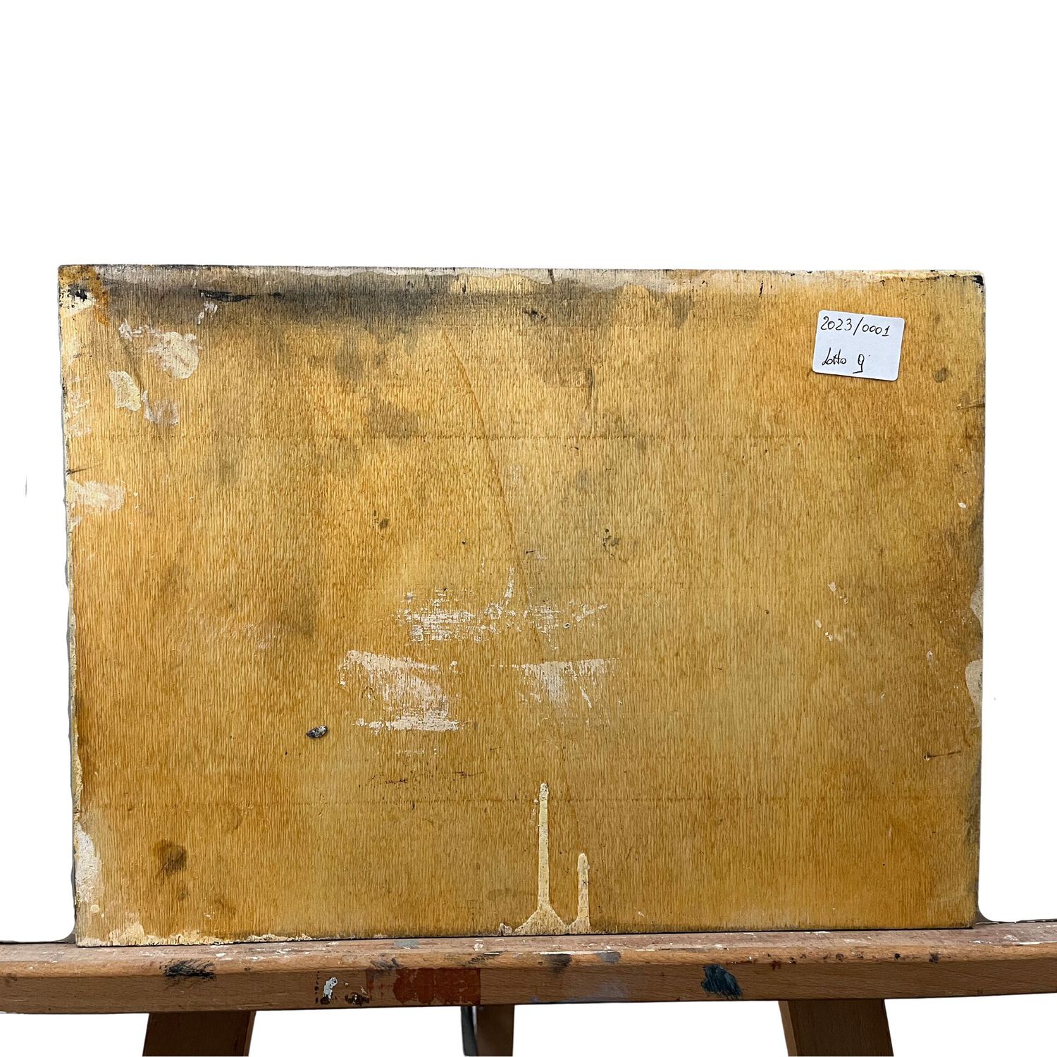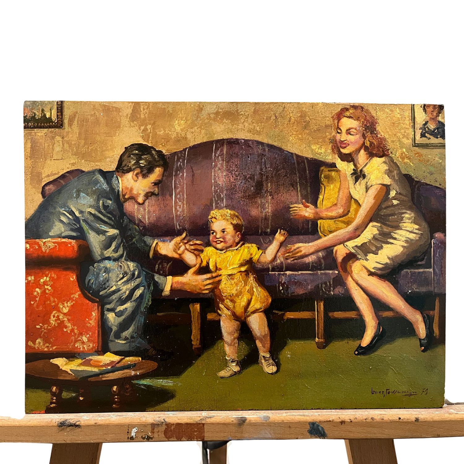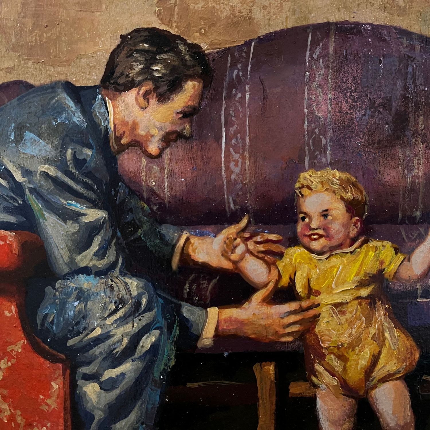 Dipinto olio su tavoletta, Scuola Continentale, raffigurante scena familiare, XX secolo.